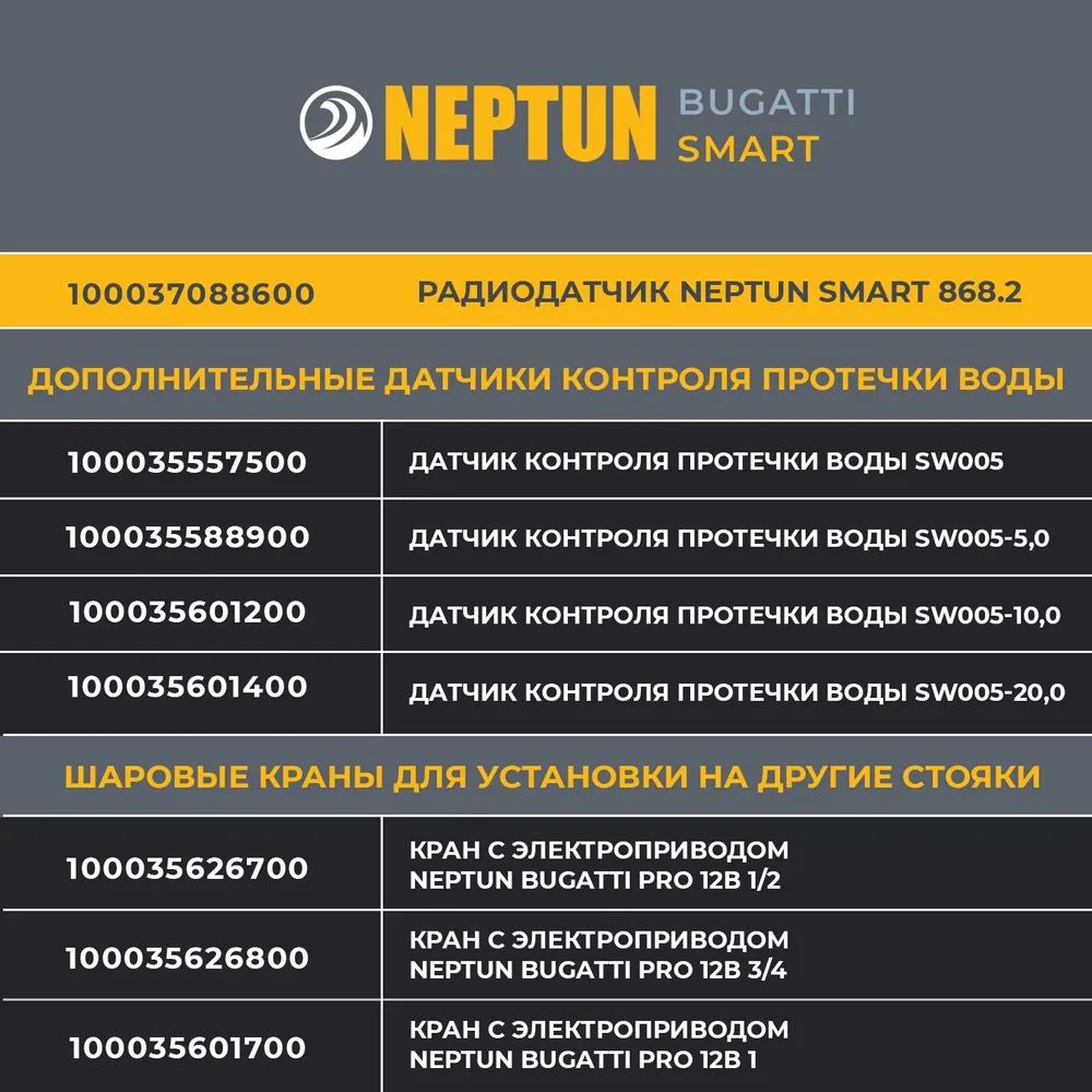 - Умная система защиты от протечки воды Neptun Bugatti Smart Tuya предназначена для обнаружения и локализации протечек воды в системах водоснабжения. Компоненты системы связаны и взаимодействуют друг с другом через центральный контроллер (модуль управления Neptun Smart Tuya), который может быть дополнительно укомплектован дополнительными платами расширения: