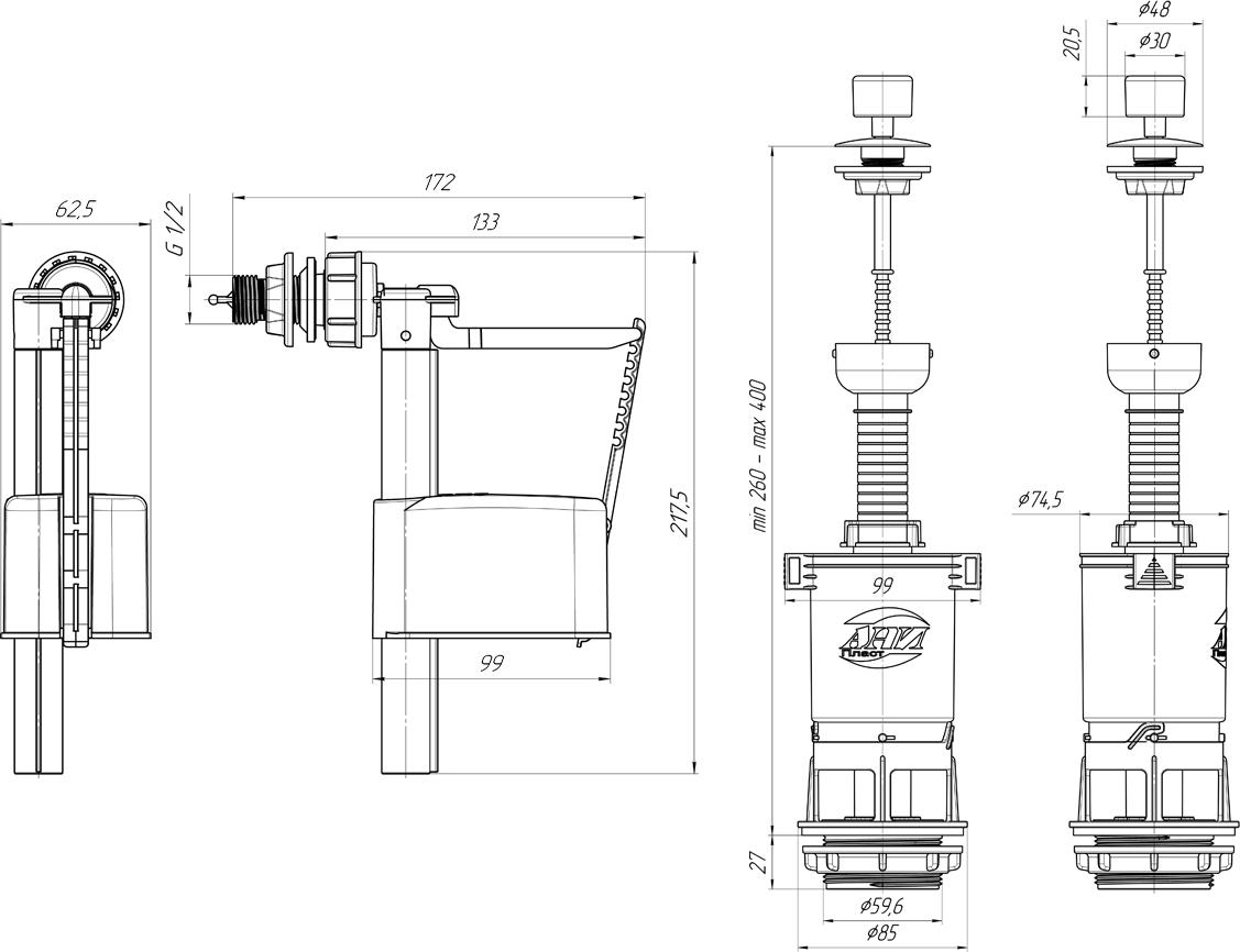 - Сливной механизм белая ручка со штоковым режимом слива, регулировка по высоте 260-400 мм. Отверстие под ручку слива в крышке бачка от 25 до 40 мм, посадочное отверстие сливной арматуры 60 мм.