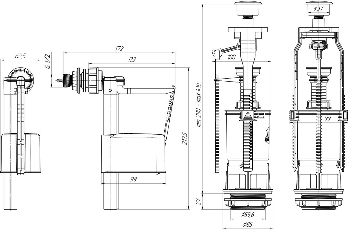 - Наливной механизм с боковой подводкой и пластиковой резьбой диаметром G 1/2