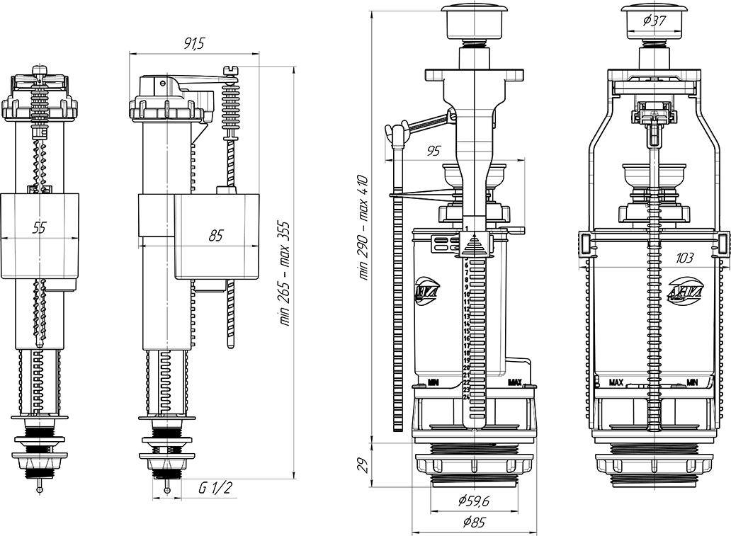 - Набор для бачка унитаза АНИ пласт WC8510C. Наливной механизм с нижней подводкой и пластиковой резьбой диаметром 1/2", регулировка по высоте 265-355 мм (стойка механизма поворачивается, устанавливается нужная высота, после чего поворачивается обратно).