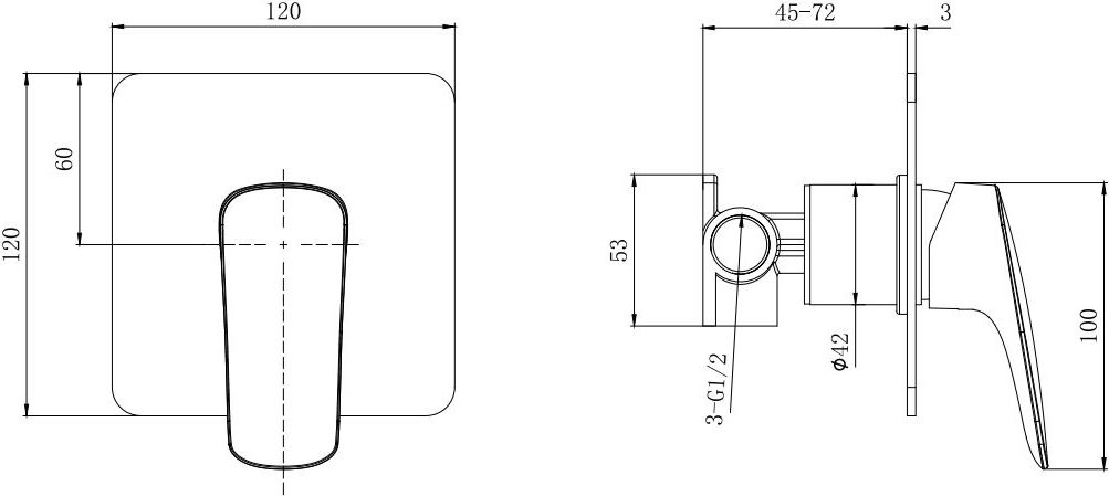 - предназначен для использования вместе с душевой системой скрытого монтажа однорычажная система регулировки силы струи и температуры воды