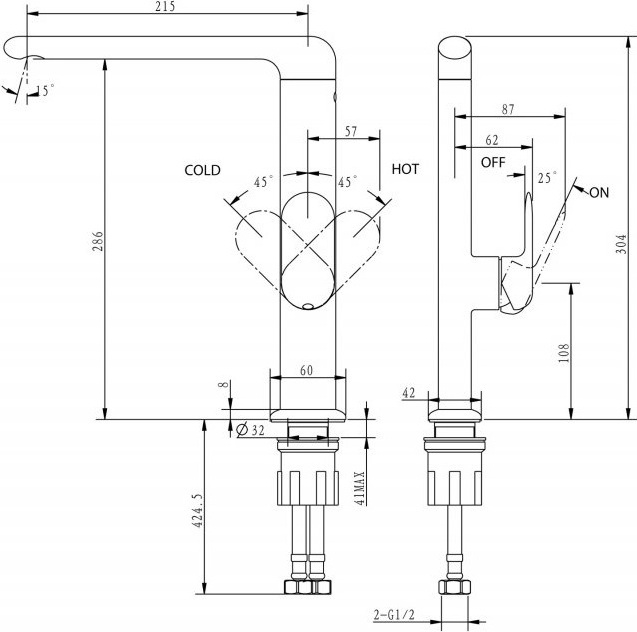 - Длина излива: 21,5 см