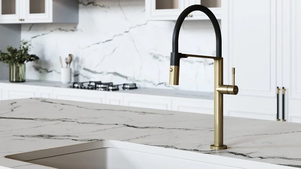 Смеситель для кухни Boheme Uno с гибким и поворотным изливом, материал латунь/силикон, цвет чёрный/золото.