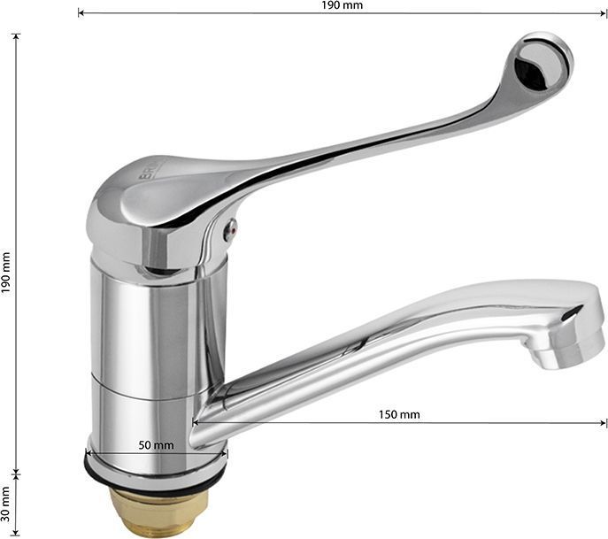 - Габаритные размеры: Высота 190 мм, длина 190 мм, длина излива 150 мм.