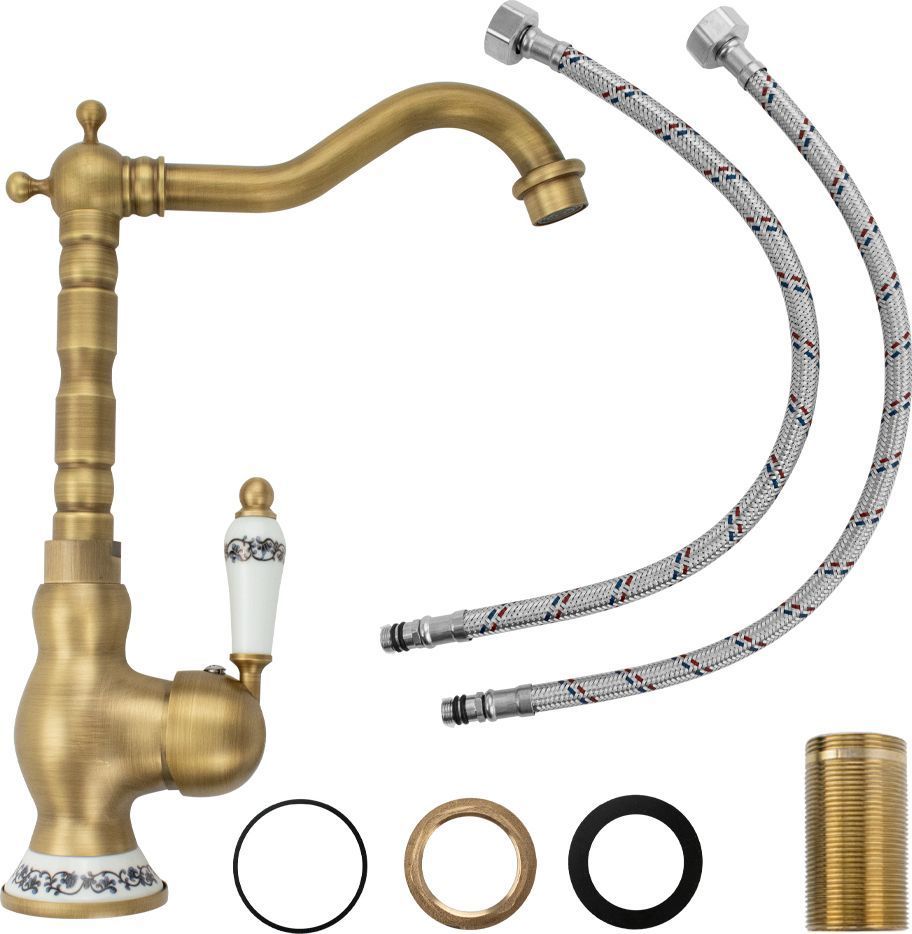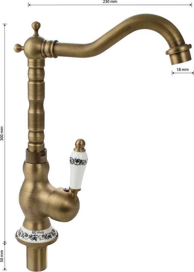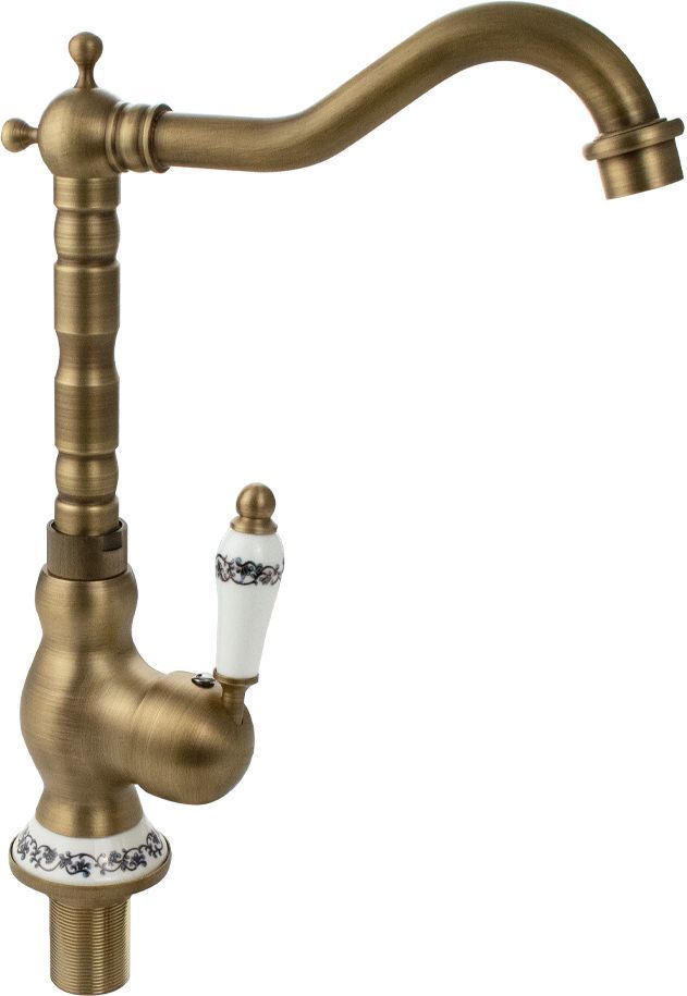 Смеситель для кухонной мойки и раковин, боковой, шаровый, корпус под состаренную бронзу с вставками белой керамики, с высоким Г-образным, поворотным вокруг оси изливом. Материал изготовления — латунь. Крепление резьба - гайка, картридж d = 40 мм, литая ручка. Аэратор для экономии воды. Габаритные размеры: высота 300 мм, длина 230 мм, диаметр посадочного седла 60 мм, длина резьбы 50 мм, длина подводки 400 мм. Вес - 1,250 кг, объём - 0,00680 м3. В комплекте паспорт, корпус с изливом, подводка 1/2, крепеж, набор прокладок.