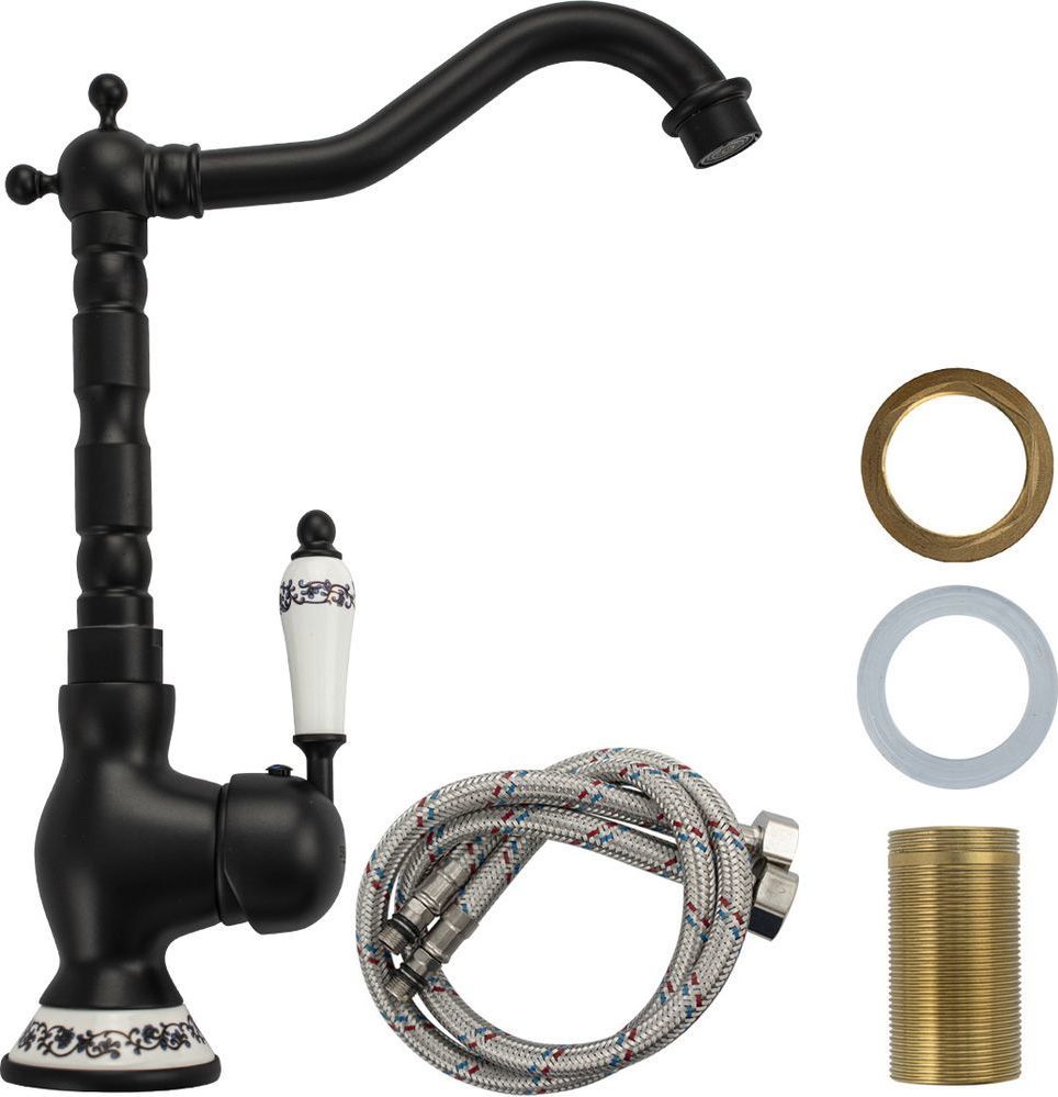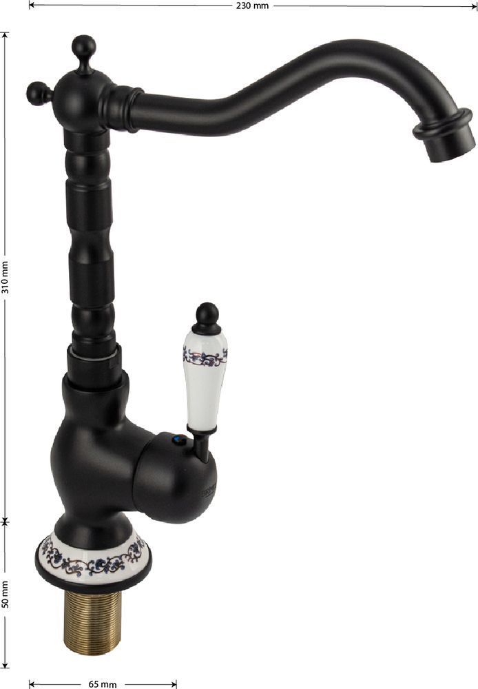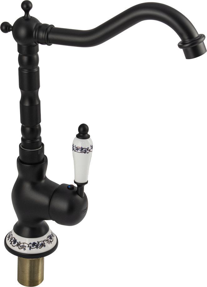 Смеситель для кухонной мойки и раковин, боковой, шаровый, черный с вставками белой керамики, с высоким Г-образным, поворотным вокруг оси изливом. Материал изготовления — латунь. Крепление резьба - гайка, картридж d = 40 мм, литая ручка. Аэратор для экономии воды. Габаритные размеры: высота 310 мм, длина 230 мм, диаметр посадочного седла 65 мм, длина резьбы 50 мм, длина подводки 400 мм. Вес - 1,250 кг, объём - 0,00680 м3. В комплекте паспорт, корпус с изливом, подводка 1/2, крепеж, набор прокладок. Вес - 1,3 кг, объект - 0,005 м3.
