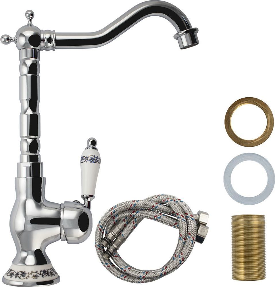 Смеситель для кухонной мойки и раковин, боковой, шаровый, хромированный с вставками белой керамики, с высоким Г-образным, поворотным вокруг оси изливом. Материал изготовления — латунь. Крепление резьба - гайка, картридж d = 40 мм, литая ручка. Аэратор для экономии воды. Габаритные размеры: высота 300 мм, длина 230 мм, диаметр посадочного седла 60 мм, длина резьбы 50 мм, длина подводки 400 мм. Вес - 1,280 кг, объём - 0,005 м3. В комплекте паспорт, корпус с изливом, подводка 1/2, крепеж, набор прокладок.
