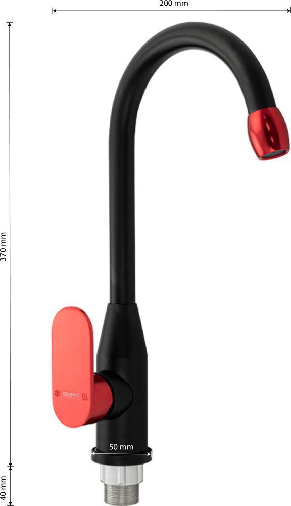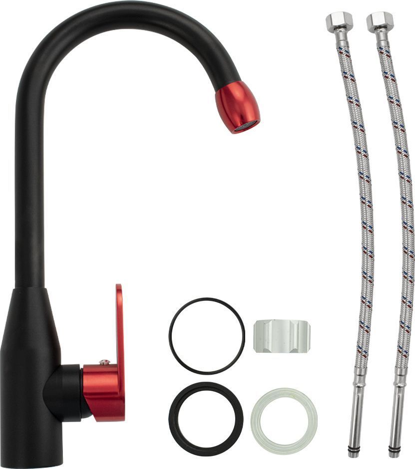 Смеситель для кухонной мойки и раковины, из авиационного алюминия, черного цвета с красной ручкой и аэратором, боковой, с высоким С-образным изливом, шаровый. Крепление резьба - гайка, картридж d = 35 мм, литая красная ручка. Большой аэратор для экономии воды. Габаритные размеры: высота 370 мм, длина 200 мм, диаметр посадочного седла 50 мм, длина резьбы 40 мм, длина подводки 350 мм. Вес - 1,500 кг, объём - 0,00627 м3. В комплекте паспорт, корпус с изливом, подводка 1/2, крепеж, набор прокладок.