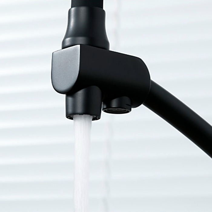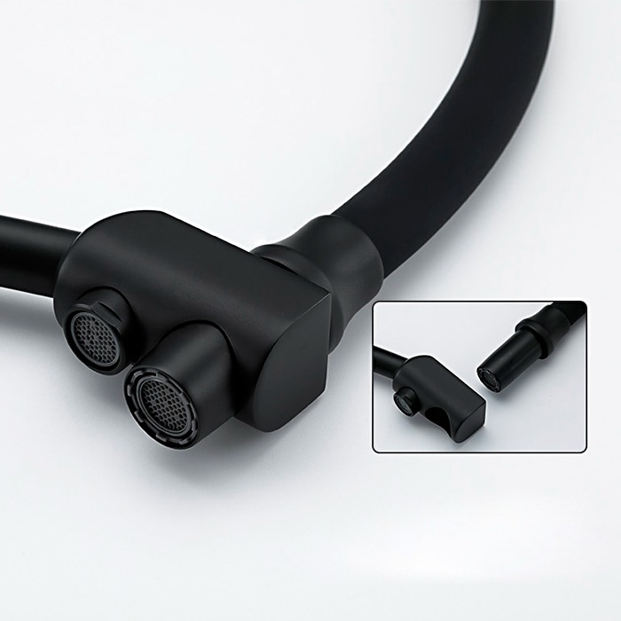 Смеситель для кухни с силиконовым изливом Gappo G4398-16 гнется во все стороны, но при этом не ломается и не трескается. С таким изливом гораздо удобнее мыть посуду, наполнять габаритные емкости. Есть кнопка для переключения режима душ. Основные материалы изготовления это латунь и силикон. Латунь относится к нержавеющим материалам. К данной модели можно подключить фильтр для очистки воды. К столешнице крепится на гайку.