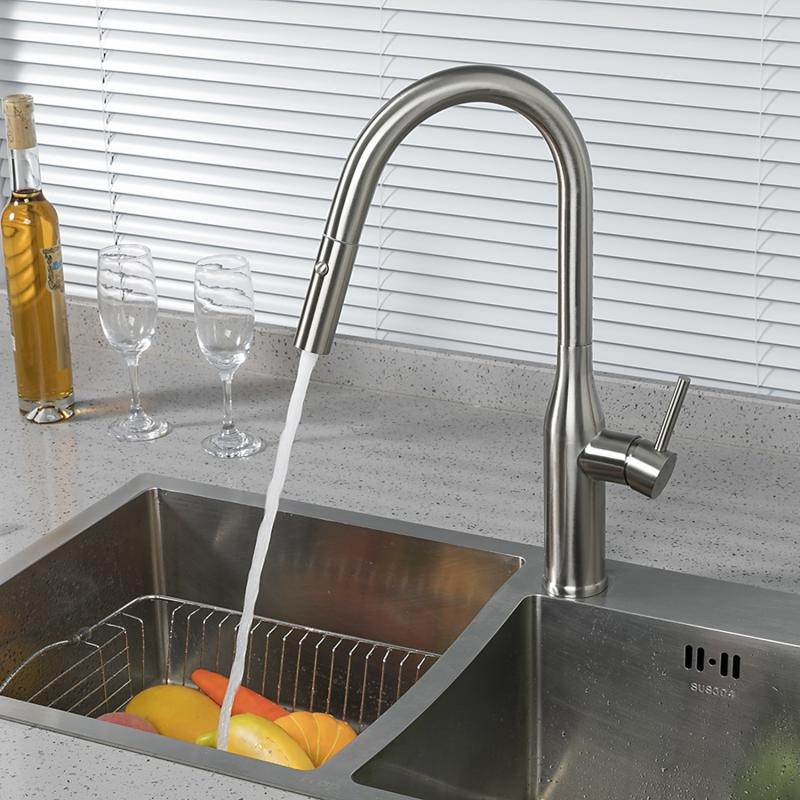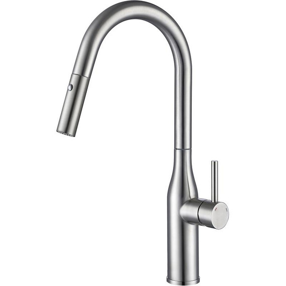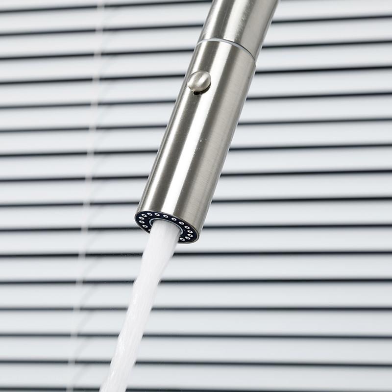 Главная особенность смесителя для кухни Gappo G4398-45 состоит в том, что у него в конструкции предусмотрена выдвижная лейка с режимом душ. С таким смесителем будет удобно наполнять большие емкости, мыть крупную посуду, овощи и фрукты. Чтобы переключаться между режимами на аэраторе есть специальная кнопка. Корпус из нержавеющей стали, цветовой оттенок сатин.