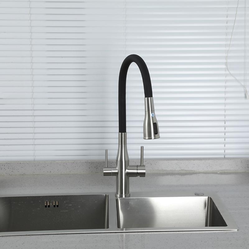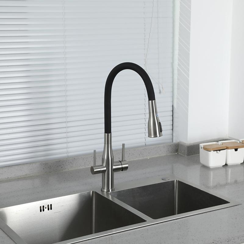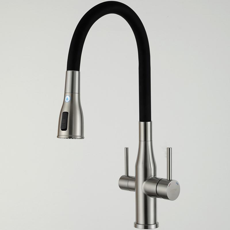 Смеситель для кухни Gappo G4399-65 с гибким изливом и подключением фильтра, материал - латунь, цвет - сатин/черный.