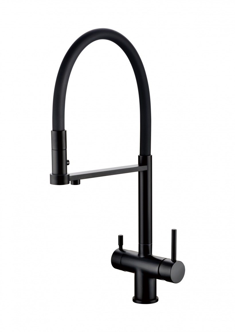 Смеситель для кухни Grocenberg GB4095BL с гибким изливом и подключением к фильтру питьевой воды, материал - латунь, цвет - чёрный матовый.