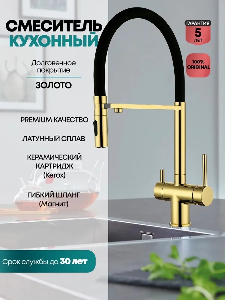Смеситель для кухни Grocenberg GB4096GO с гибким изливом и подключением к фильтру питьевой воды, материал - латунь, цвет - золото.