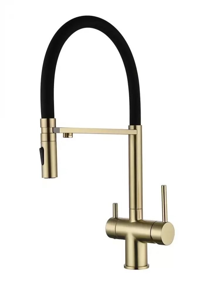 Смеситель для кухни Grocenberg GB4096MG с гибким изливом и подключением к фильтру питьевой воды, материал - латунь, цвет - матовое золото.