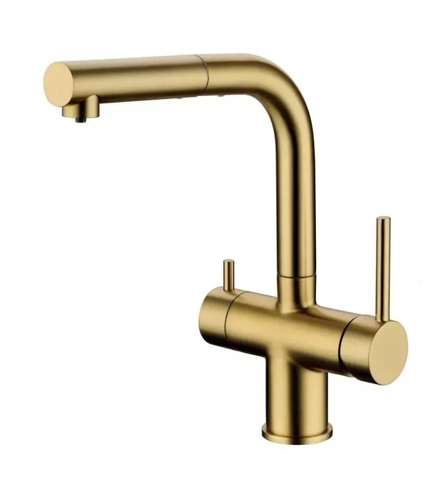 Смеситель для кухни Grocenberg GB4097MG с выдвижным изливом и подключением к фильтру питьевой воды, материал латунь, цвет - матовое золото.
