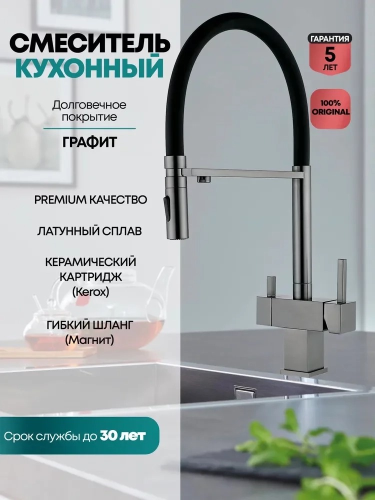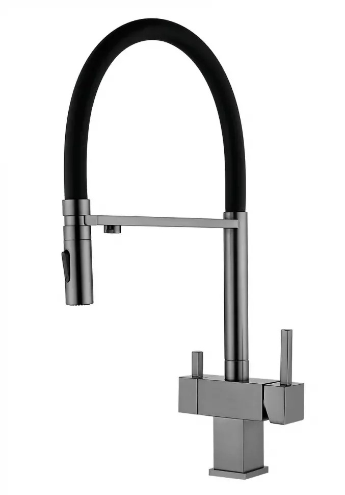 Смеситель для кухни Grocenberg GB4098BG с гибким изливом и подключением к фильтру питьевой воды, материал - латунь, цвет - графит.