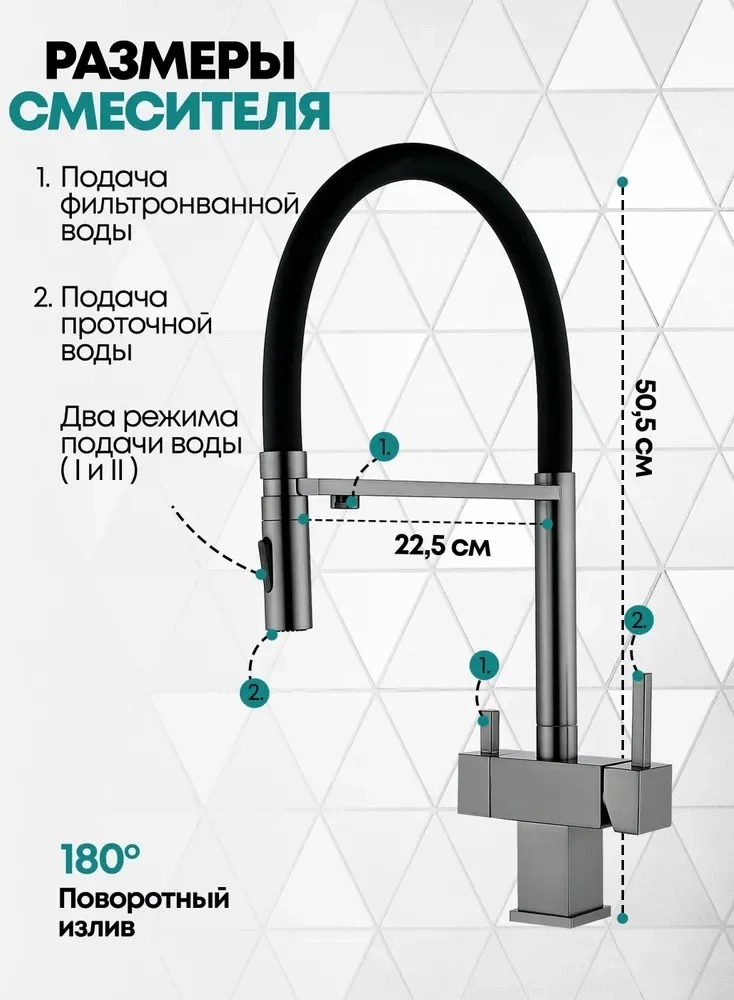 - Смеситель с подключением к фильтру и двумя режимами лейки.