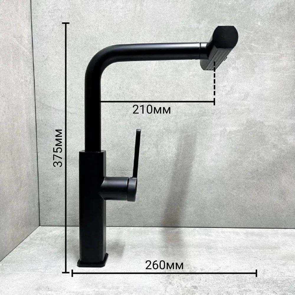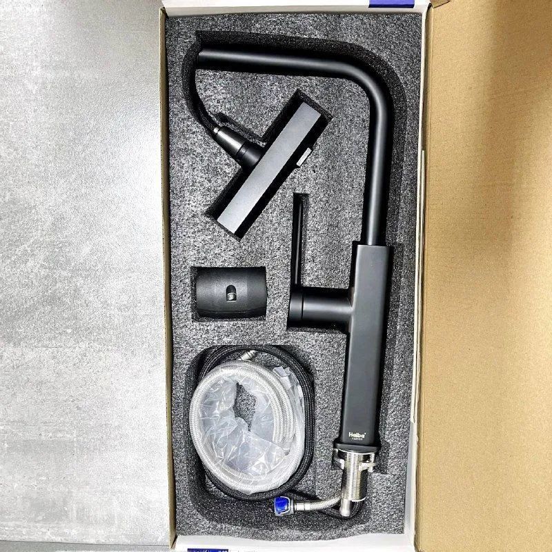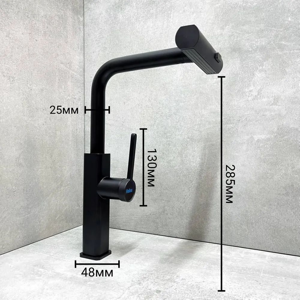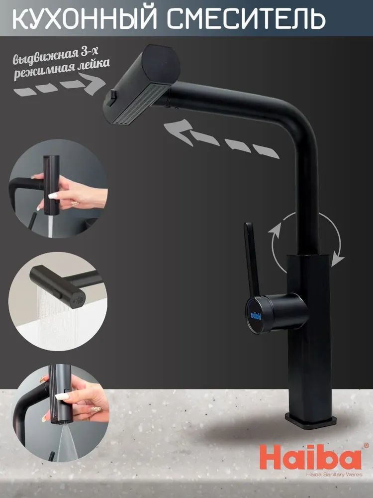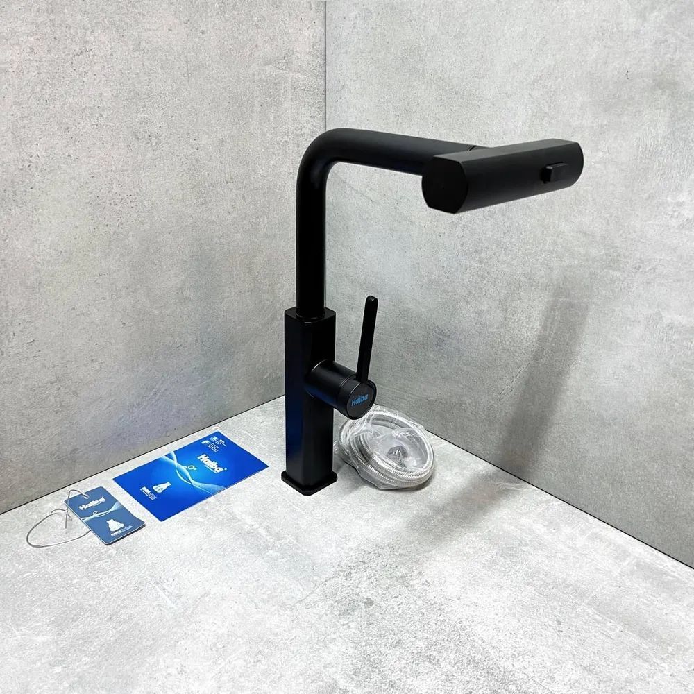 Смеситель для кухни Haiba HB73824-7 с выдвижным изливом, материал латунь, цвет чёрный матовый.