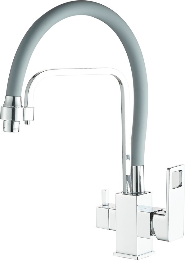 Смеситель для кухни Haiba HB76615 с подключением фильтра питьевой воды и гибким, поворотным изливом. Материал - латунь, цвет - хром/серый.