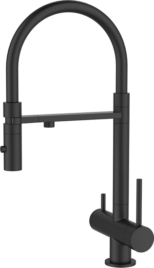 Профессиональный смеситель для кухни Ace с черным гибким изливом и отдельным каналом для фильтрованной воды в поперечной планке. Продуманный и функциональный, он успешно справляется с повседневными задачами на кухне.