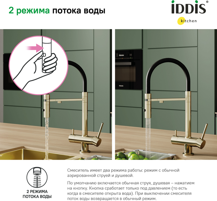 - 2 режима подачи воды: «душ» и стандартная аэрированная струя. Переключаются нажатием кнопки на изливе.