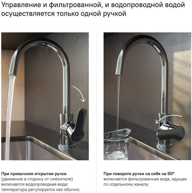 - подача фильтрованной воды осуществляется при повороте ручки в закрытом состоянии