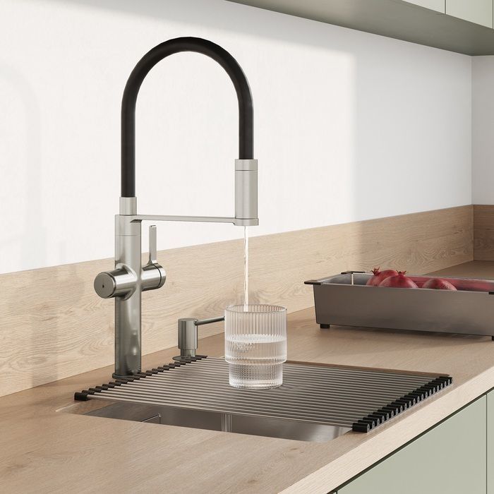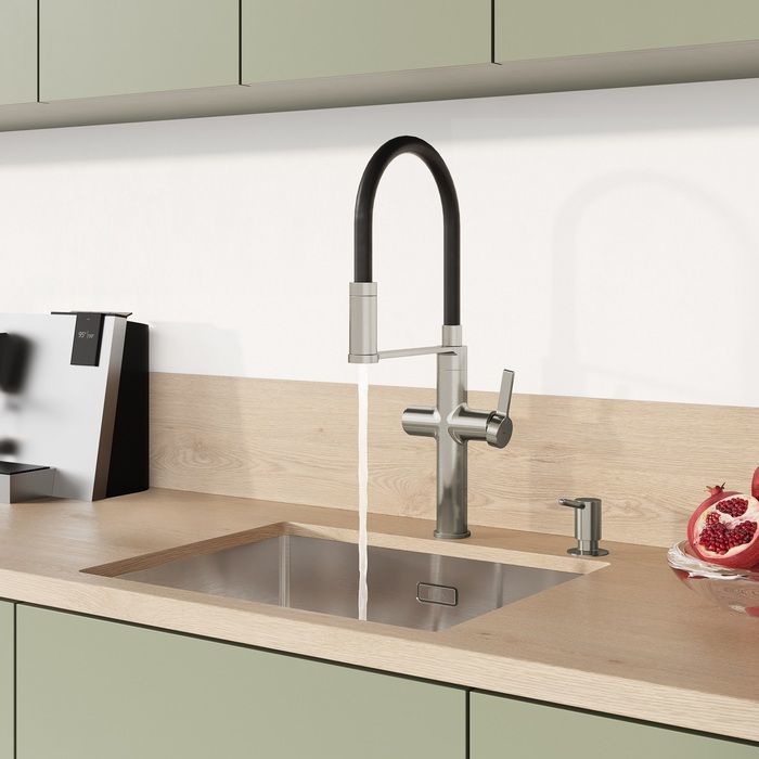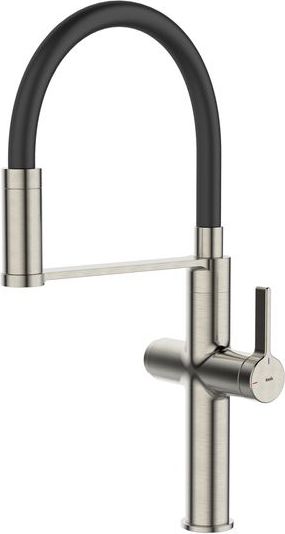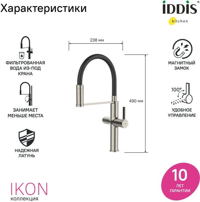 - Профессиональный смеситель для кухни Ikon в сатиновом цвете с чёрным гибким изливом и отдельным каналом для фильтрованной воды. Современный, продуманный и функциональный, он успешно справляется с повседневными задачами на кухне.