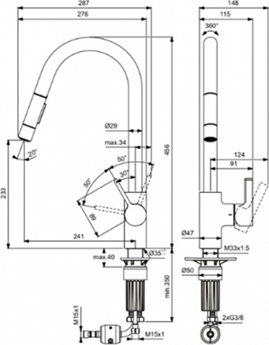 - трубчатый излив R с углом поворота 360° и выдвижным душем с 2 функциями