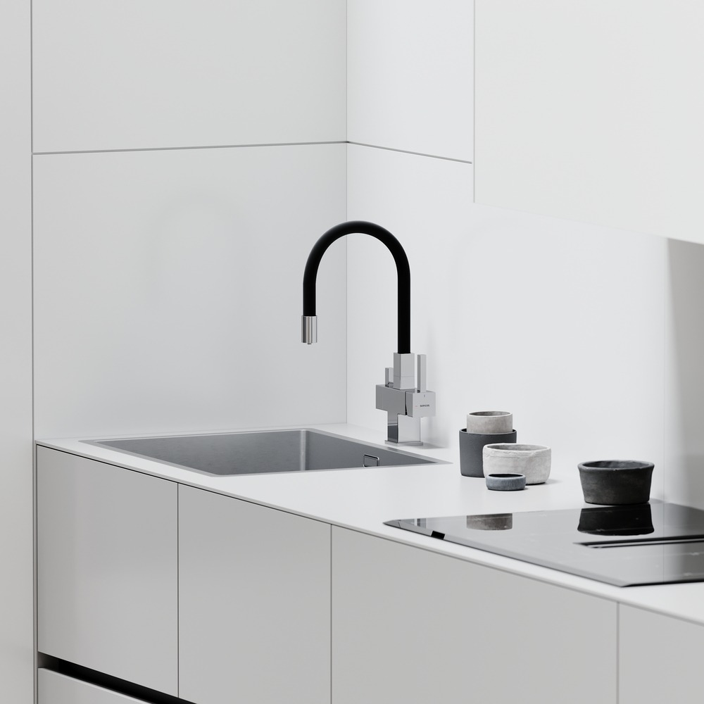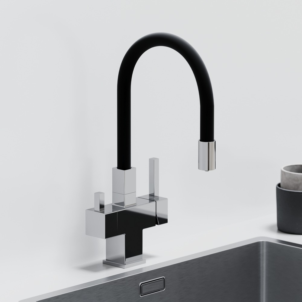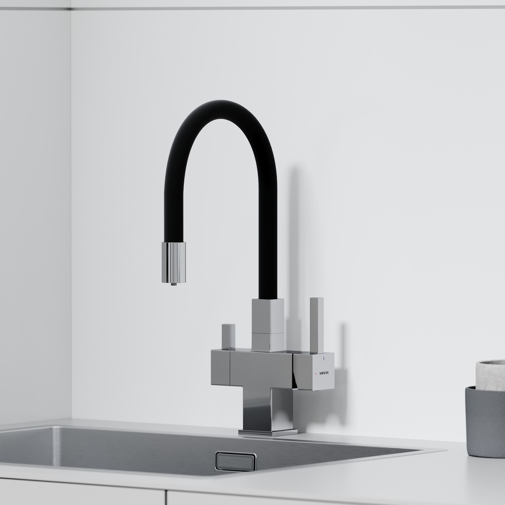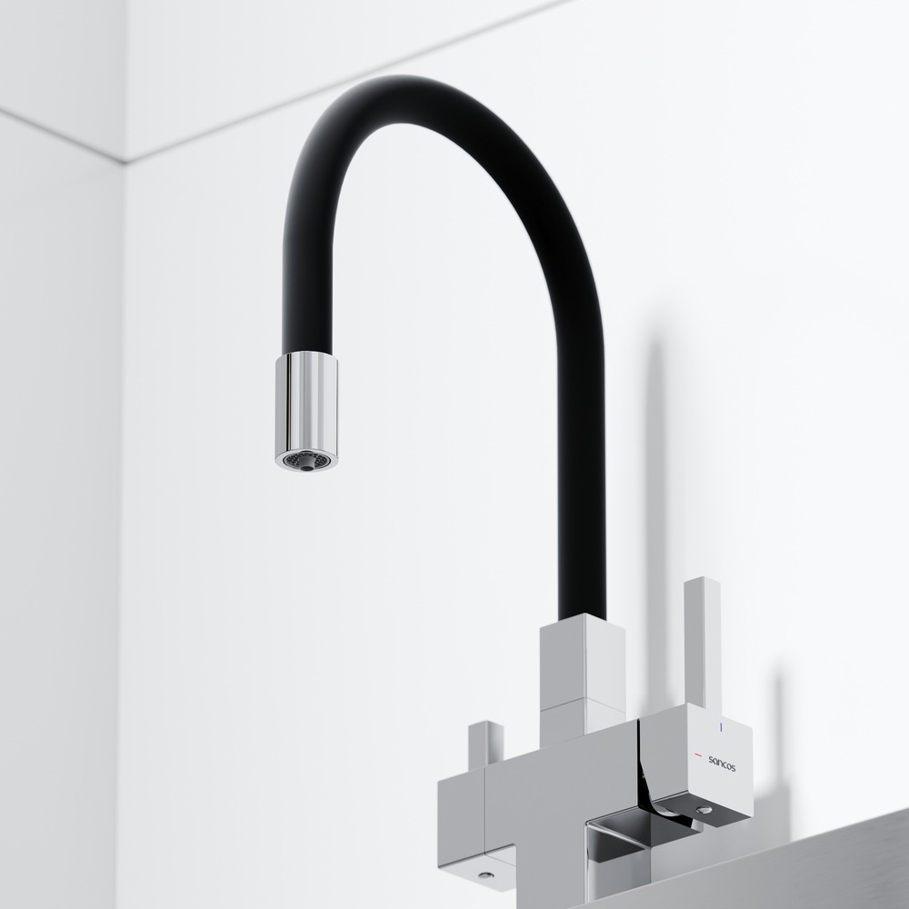 Смеситель для кухни Sancos Arno SC4005CH с гибким, поворотным изливом и подключением фильтра питьевой воды , материал - латунь, цвет - хром/чёрный.