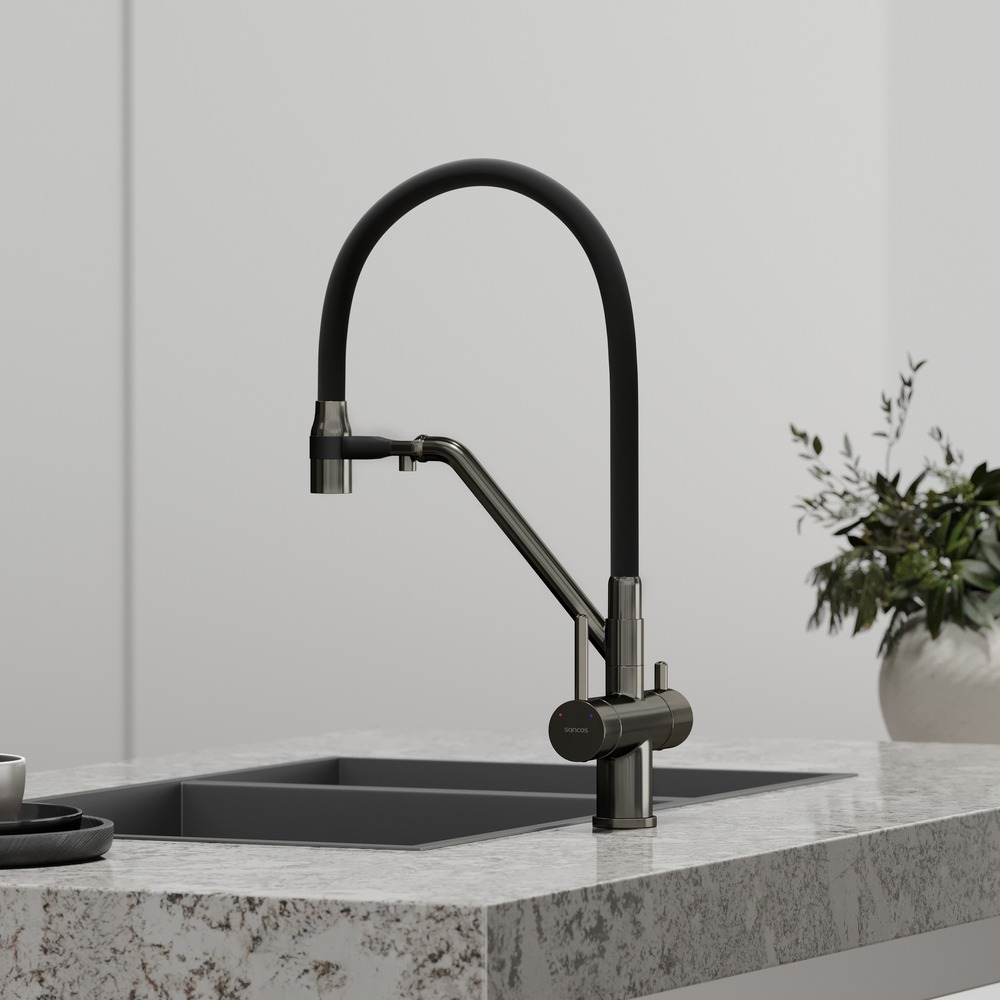 Смеситель для кухни Sancos Dora SC4003GG с гибким, поворотным изливом и подключением фильтра питьевой воды , материал - латунь, цвет - вороненая сталь/чёрный.