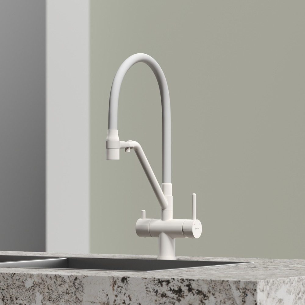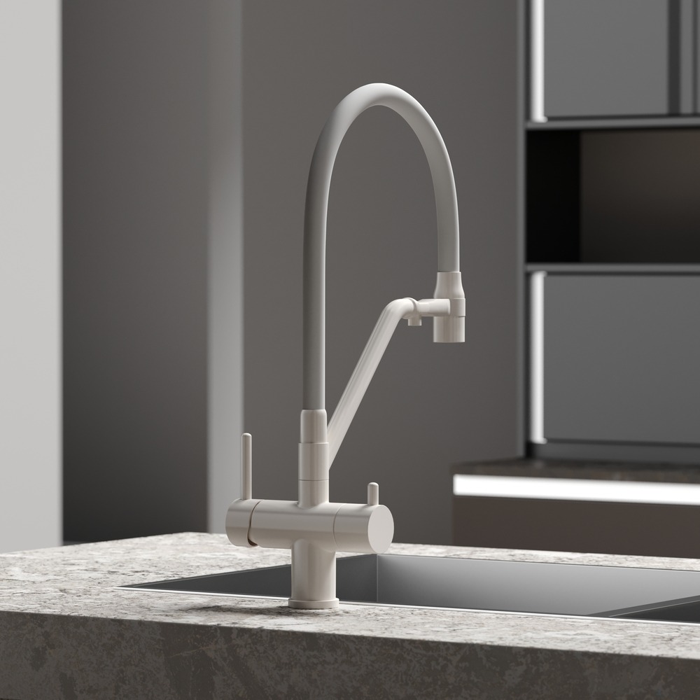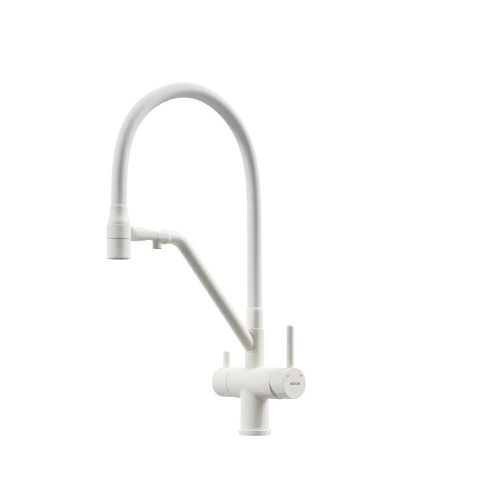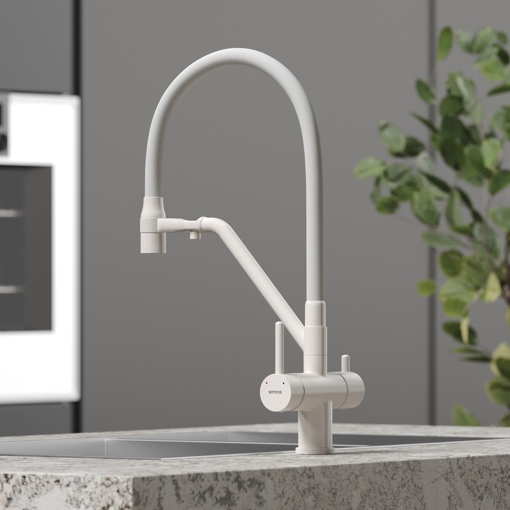 Смеситель для кухни Sancos Dora SC4003MW с гибким, поворотным изливом и подключением фильтра питьевой воды , материал - латунь, цвет - матовый белый/белый.