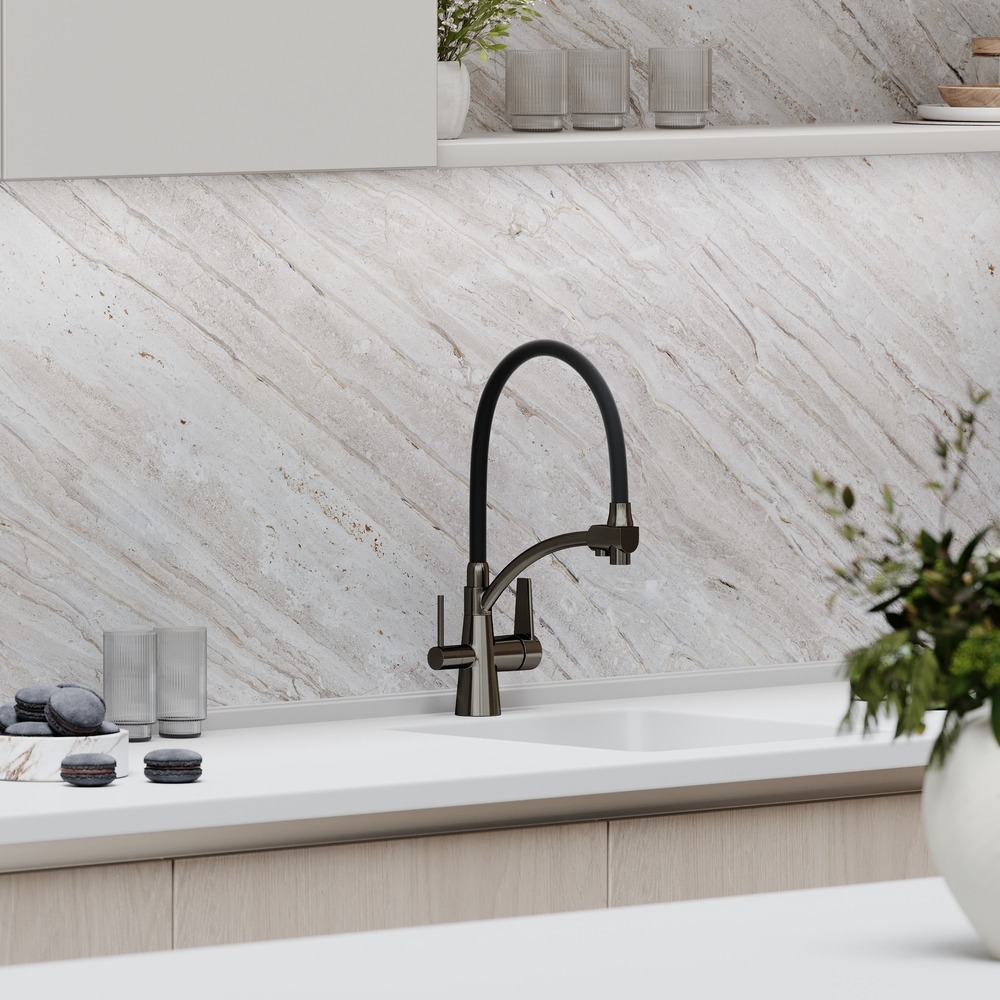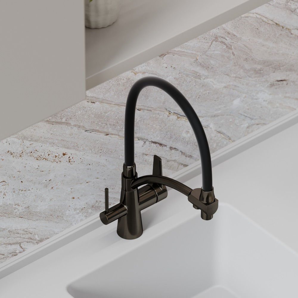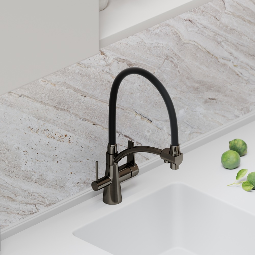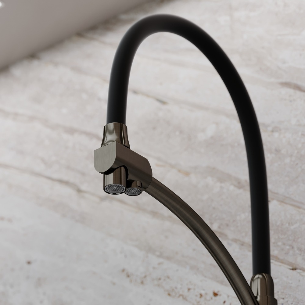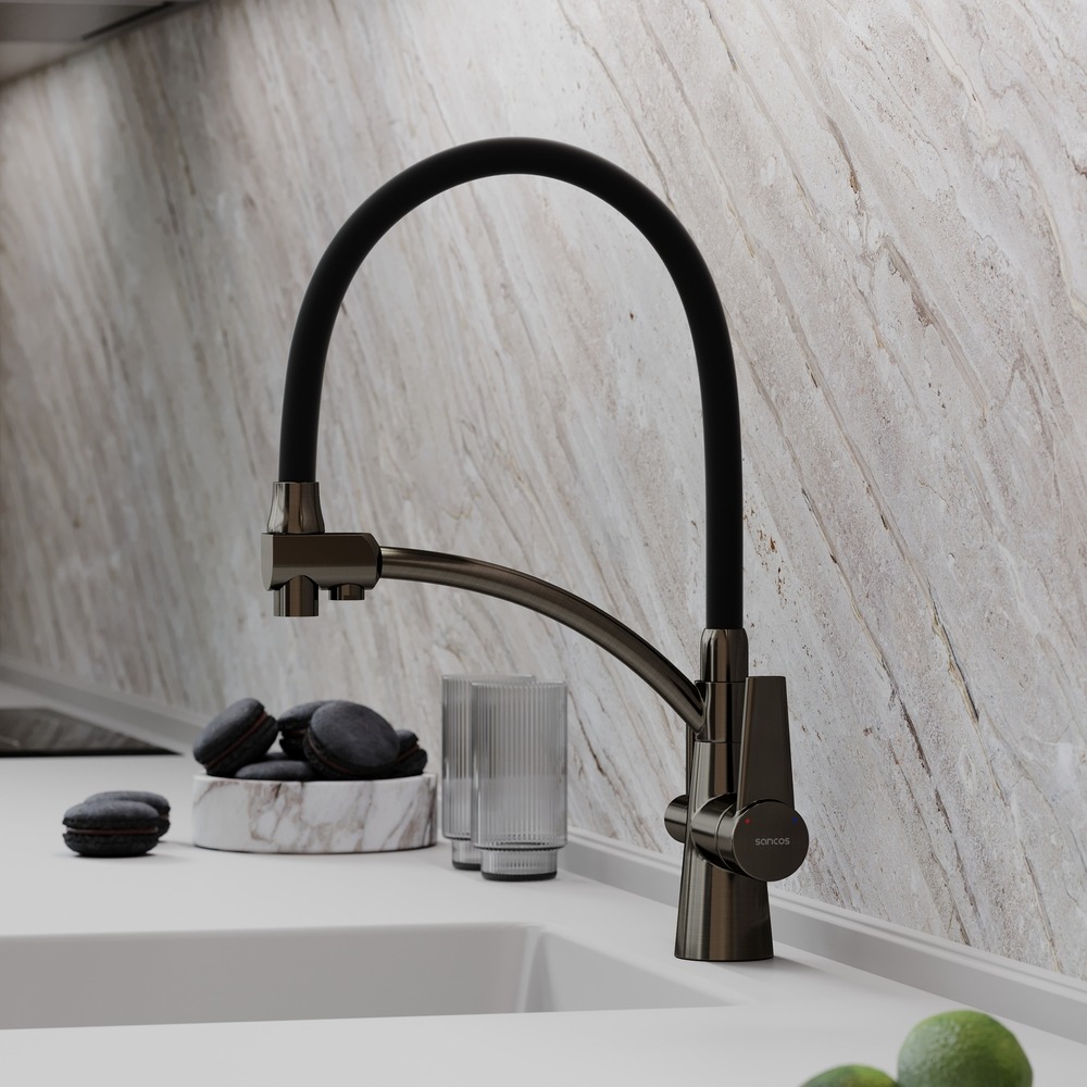 Смеситель для кухни Sancos Eri SC4001GG с гибким, поворотным изливом и подключением фильтра питьевой воды , материал - латунь, цвет - сталь/черный.