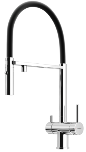 Смеситель для кухни Sancos Imola SC4010CH с гибким, поворотным изливом и подключением фильтра питьевой воды, материал - латунь, цвет - хром/чёрный.