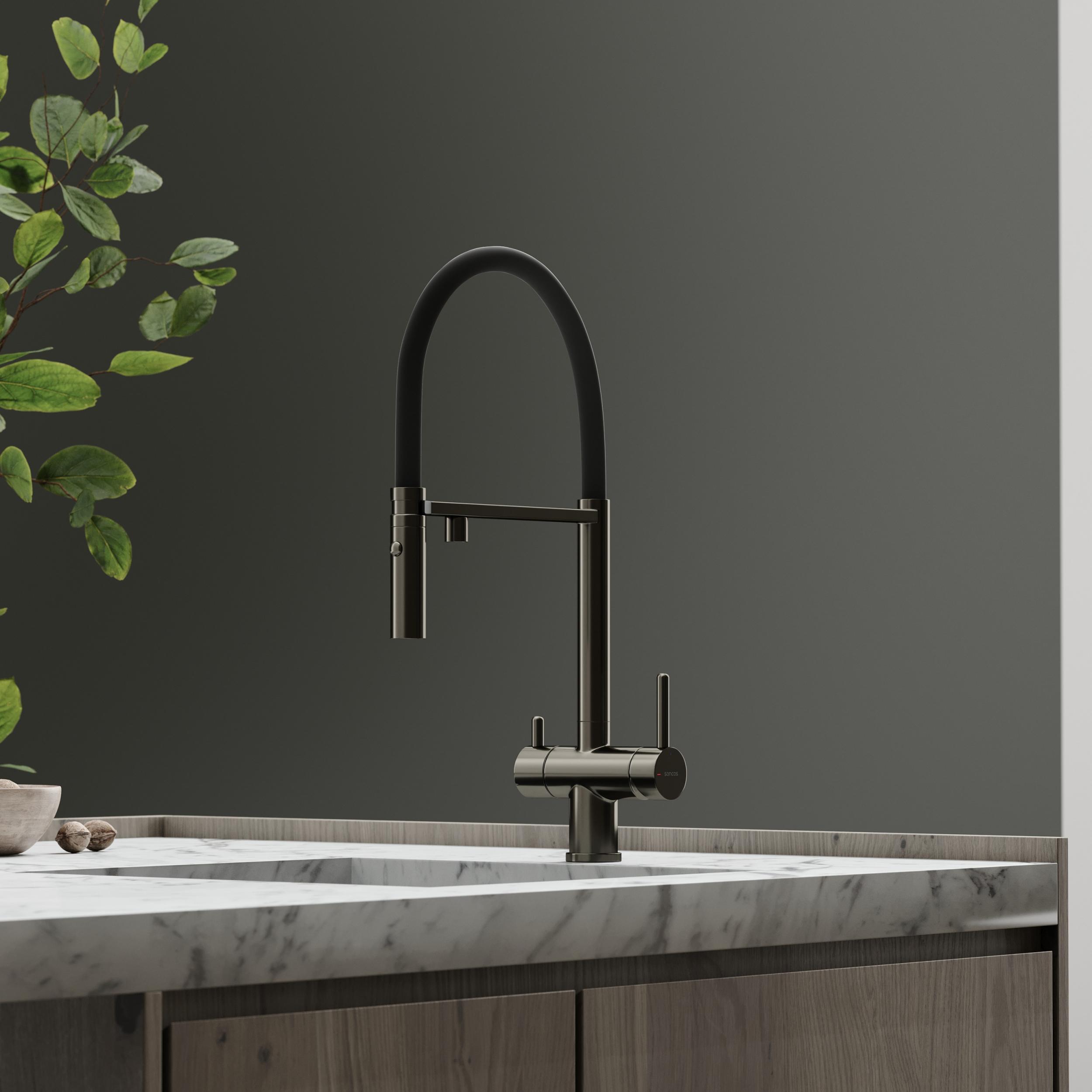 Смеситель для кухни Sancos Imola SC4010GG с гибким, поворотным изливом и подключением фильтра питьевой воды, материал - латунь, цвет - вороненая сталь/чёрный.