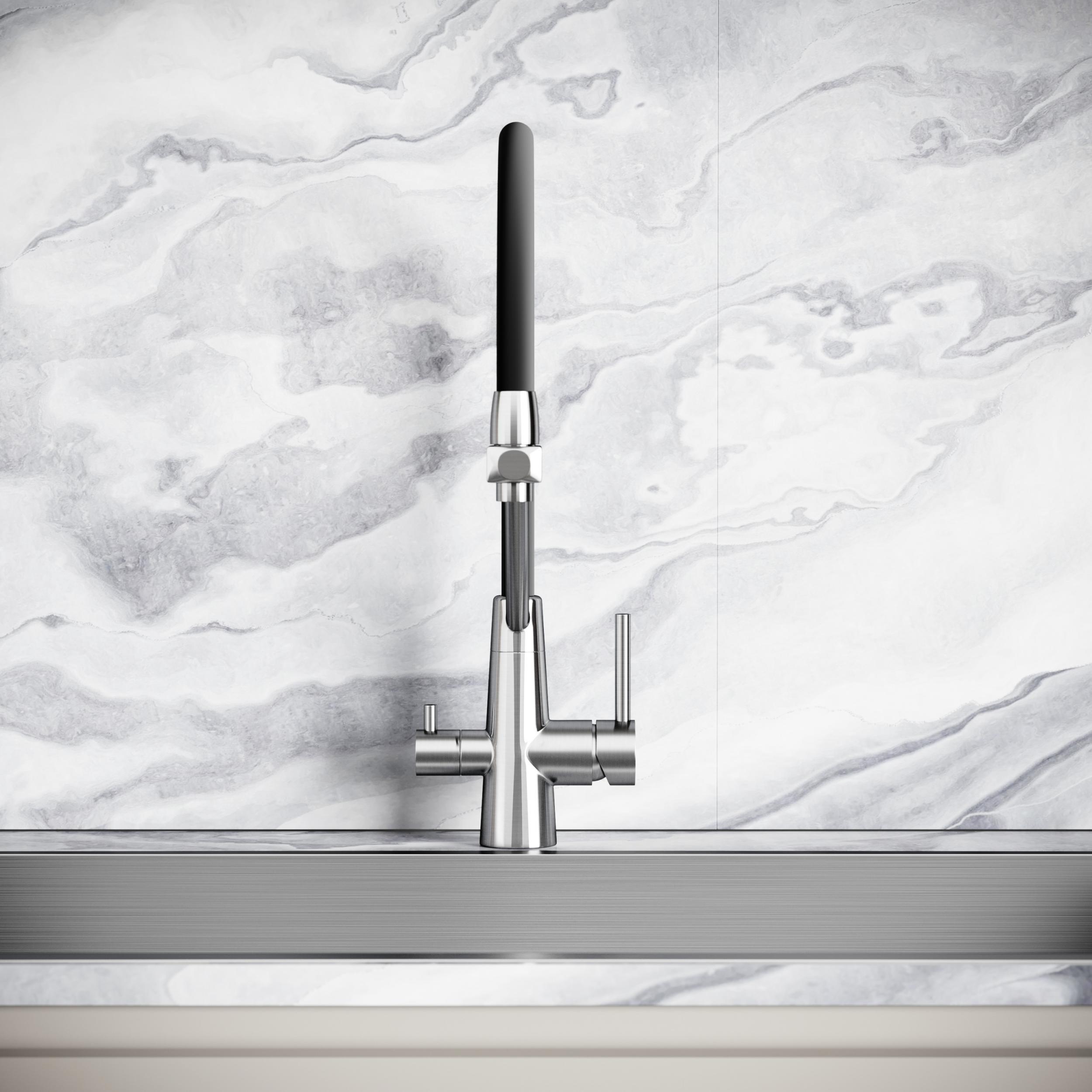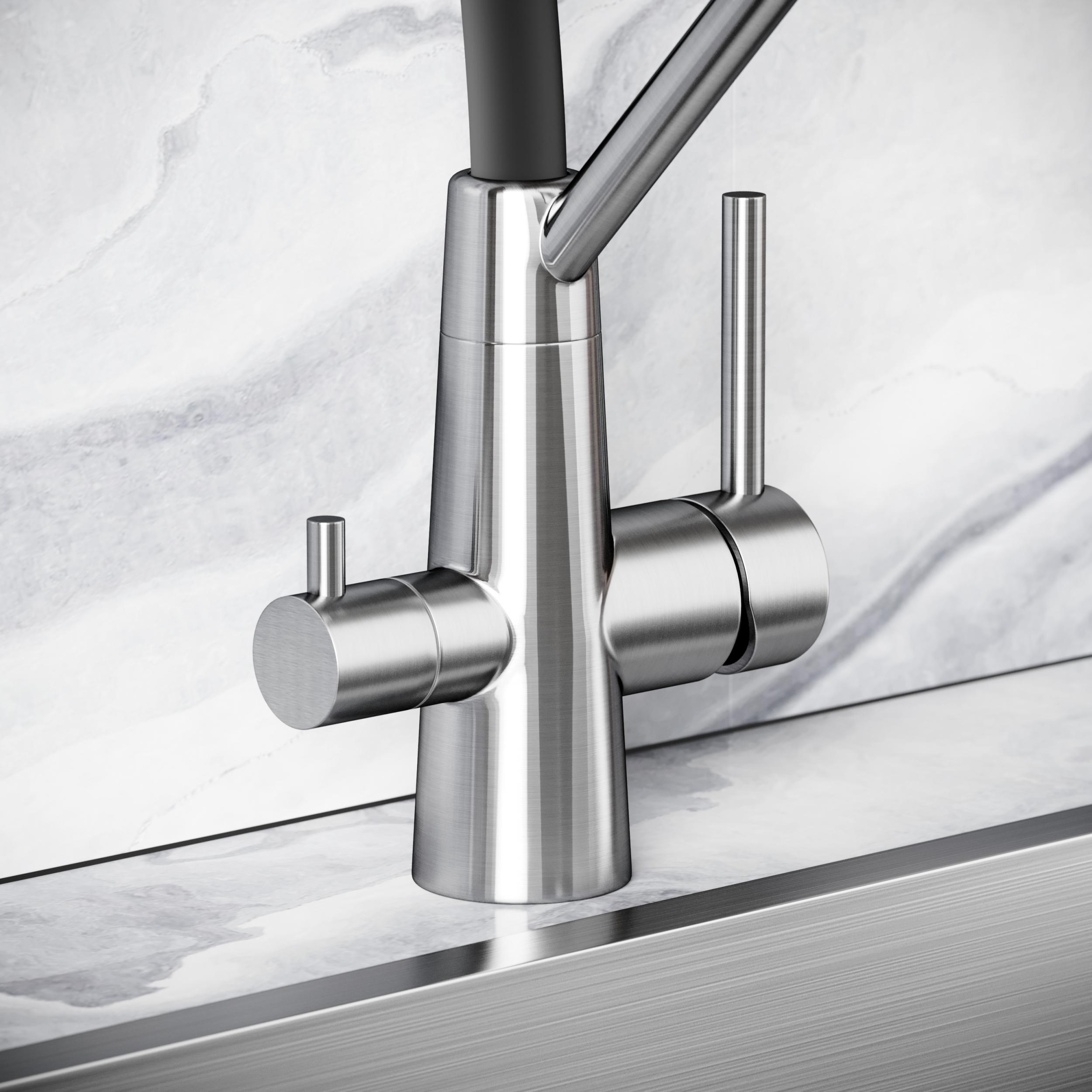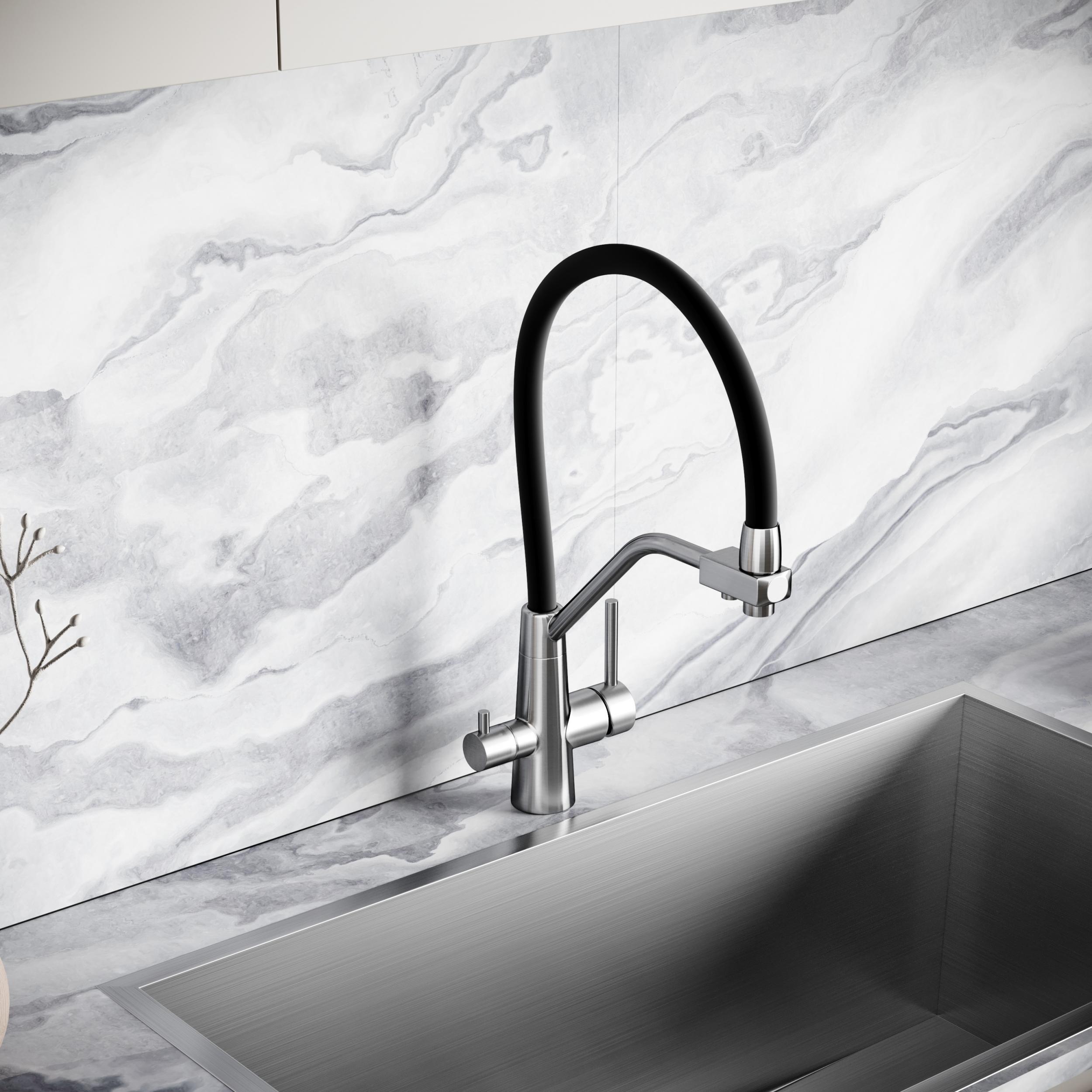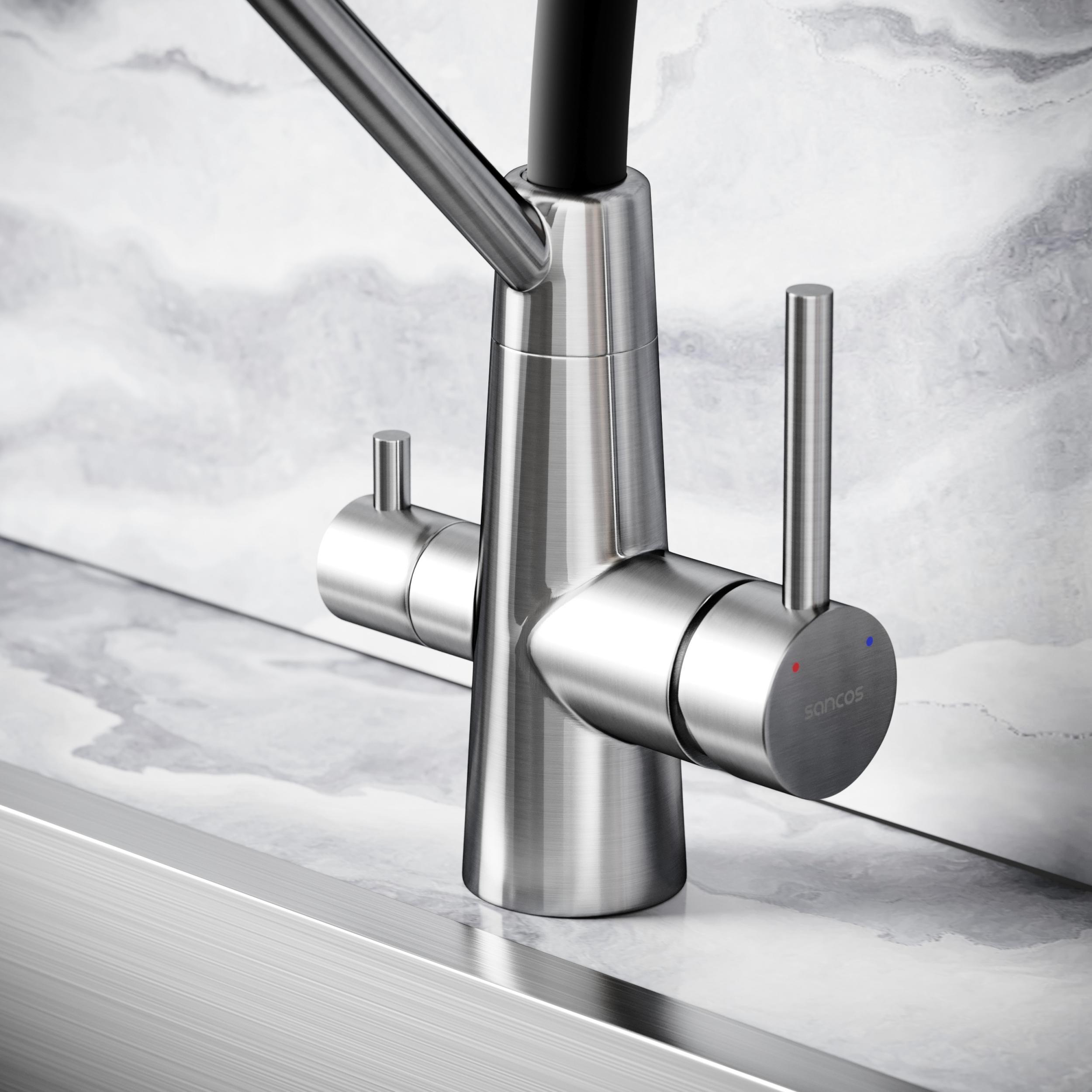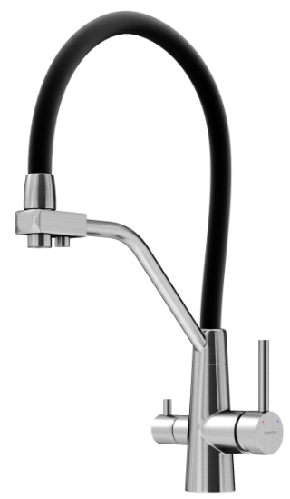 Смеситель для кухни Sancos Nolia SC12003SS с гибким, поворотным изливом и подключением фильтра питьевой воды , материал - нержавеющая сталь, цвет - хром.