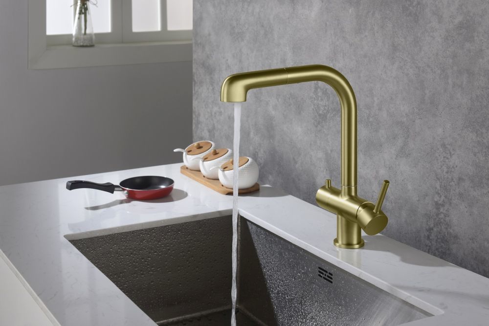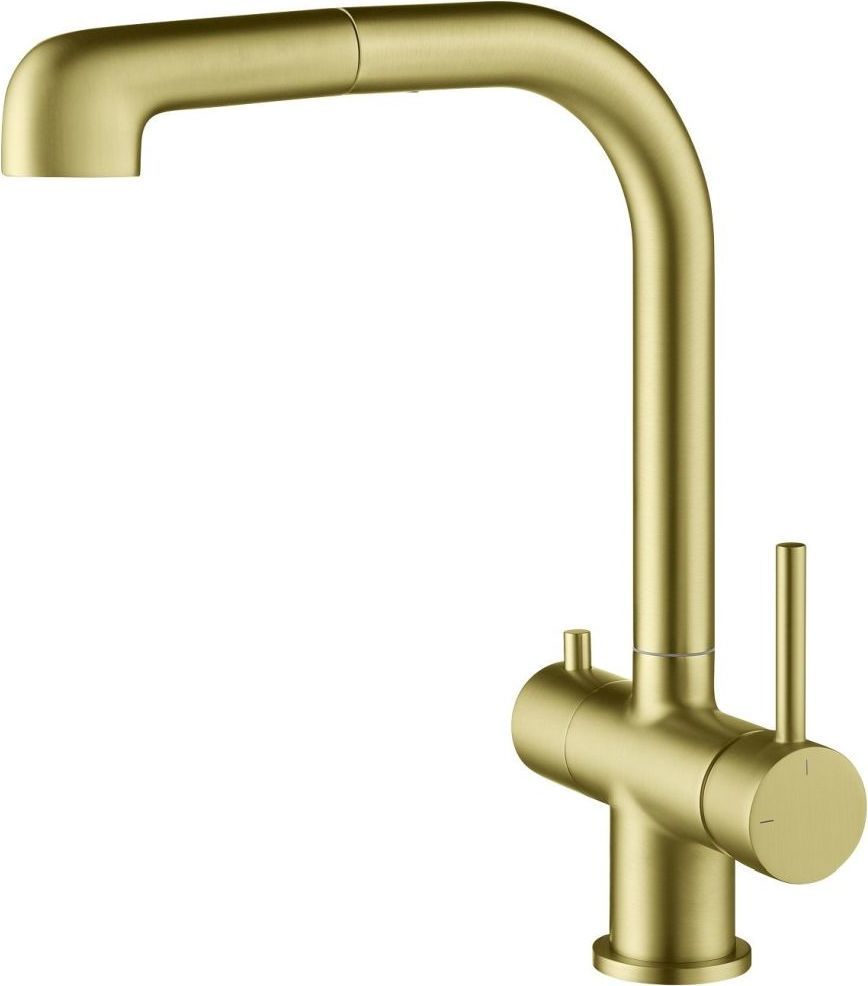 Смеситель для кухни Timo Saona 2346/17FL с подключением питьевой воды и выдвижным изливом, материал - латунь, цвет - золото матовое.