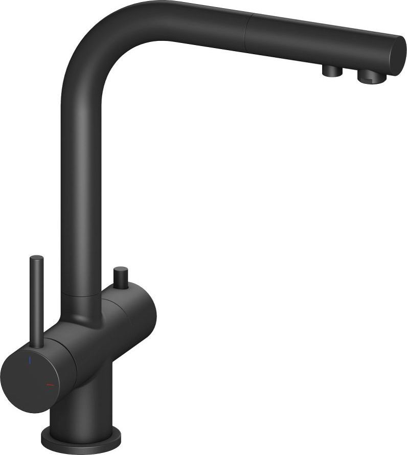 Смеситель для кухни Timo Saona 2356/03FL с подключением питьевой воды и выдвижным изливом, материал - латунь, цвет - черный матовый.