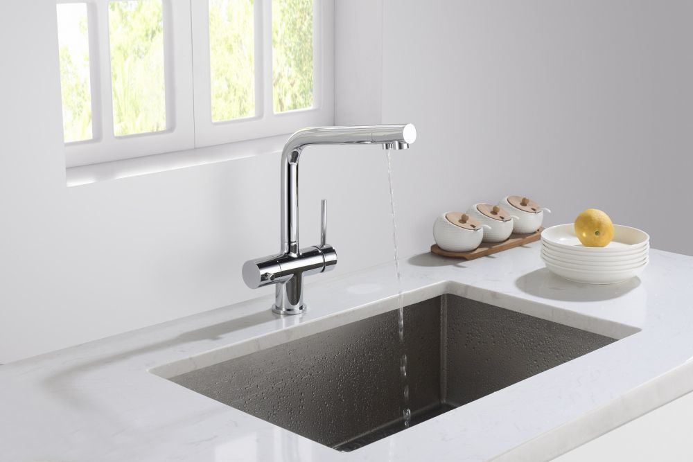 - Подача фильтрованной воды осуществляется поворотом ручки дивертора, расположенной слева на корпусе смесителя