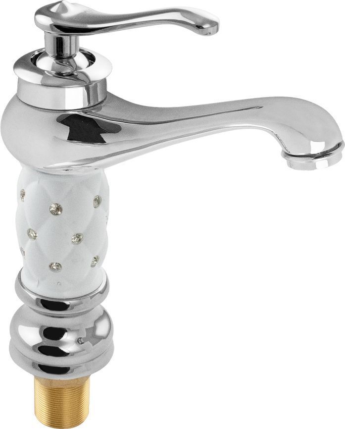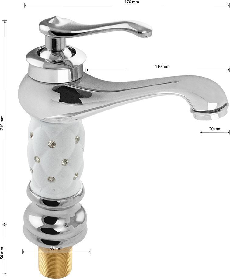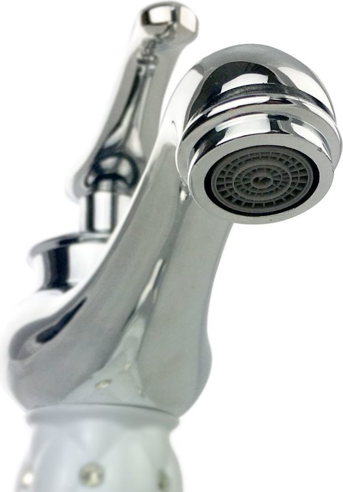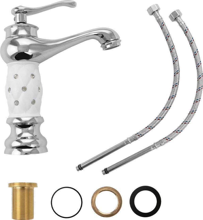 Смеситель для раковины, хромированный, с белой керамичекой вставкой со стразами на корпусе, с коротким литым изливом, литой корпус, литая ручка, шаровый. Материал изготовления — ЦАМ (цинк-алюминий-медь) + нержавеющая сталь. Крепление резьба - гайка, картридж d = 40 мм. Аэратор для экономии воды. Габаритные размеры: высота 210 мм, длина 170 мм, длина излива 110 мм, диаметр посадочного седла 60 мм, длина резьбы 50 мм, длина подводки 400 мм. Вес - 1,150 кг, объём - 0,00385 м3. В комплекте паспорт, корпус, подводка 1/2, крепеж, набор прокладок.