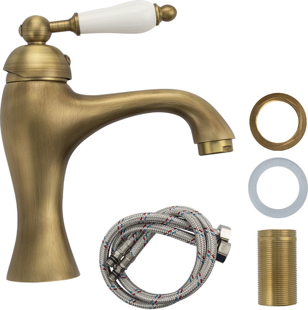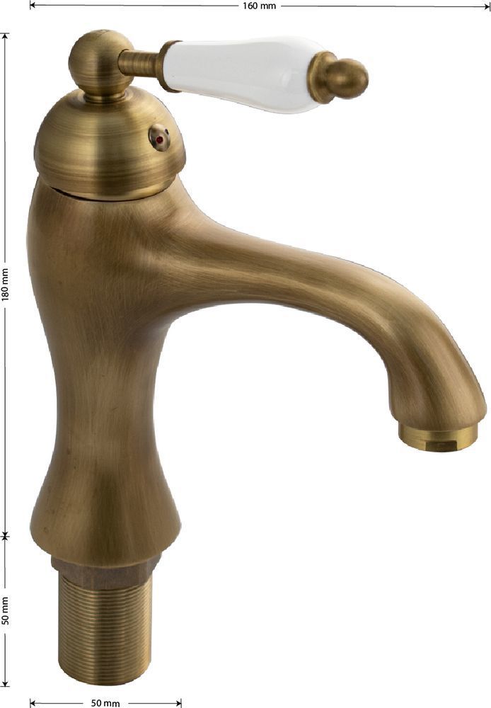 Смеситель для раковины, под бронзу, шаровый из латуни. Габаритные размеры: высота 180 мм, ширина 160 мм, диаметр посадочного седла 50 мм, длина резьбы 50 мм, длина подводки 500 мм. Вес - 1,1 кг, объем - 0,004 м3.