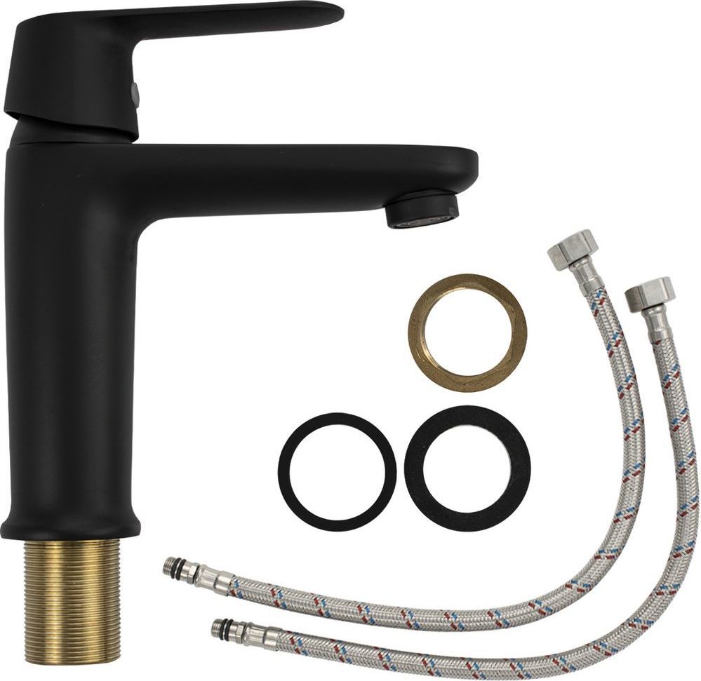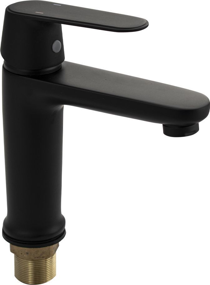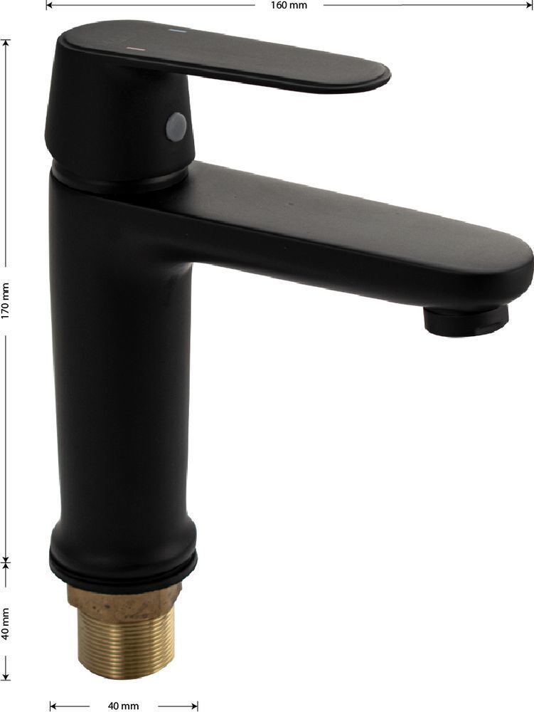 Смеситель для раковины, литой корпус, цвет чёрный, с прямым плоским изливом, ручка литая, шаровый. Крепление резьба - гайка, картридж d = 35 мм. Аэратор для экономии воды. Такая модель может использоваться на домашней кухне, на даче, в медицинских учреждениях и общественных местах. Габаритные размеры: высота 170 мм, длина 160 мм, посадочное седло 40 мм, длина резьбы 40 мм, длина подводки 500 мм. Вес - 1.100 кг, объём - 0,00325 м3. В комплекте паспорт, корпус, подводка 1/2, крепеж, набор прокладок.