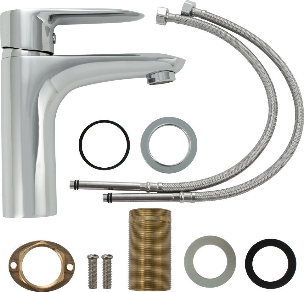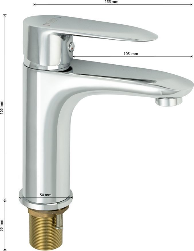 Смеситель для раковины, латунный корпус, хромированный, с коротким изливом, литой корпус, литая ручка, шаровый. Крепление резьба - гайка, картридж d = 35 мм. Аэратор для экономии воды. Габаритные размеры: высота 165 мм, длина 155 мм, длина излива 105 мм, диаметр посадочного седла 50 мм, длина резьбы 55 мм, длина подводки 500 мм. Вес - 1,300 кг, объём - 0,00278 м3. В комплекте паспорт, корпус, подводка 1/2, крепеж, набор прокладок.