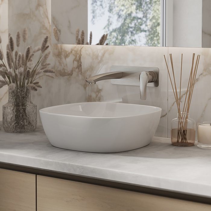 Смеситель для раковины настенный Iddis Ray RAYBN00i65 со скрытой частью, материал - латунь, цвет - сатин.