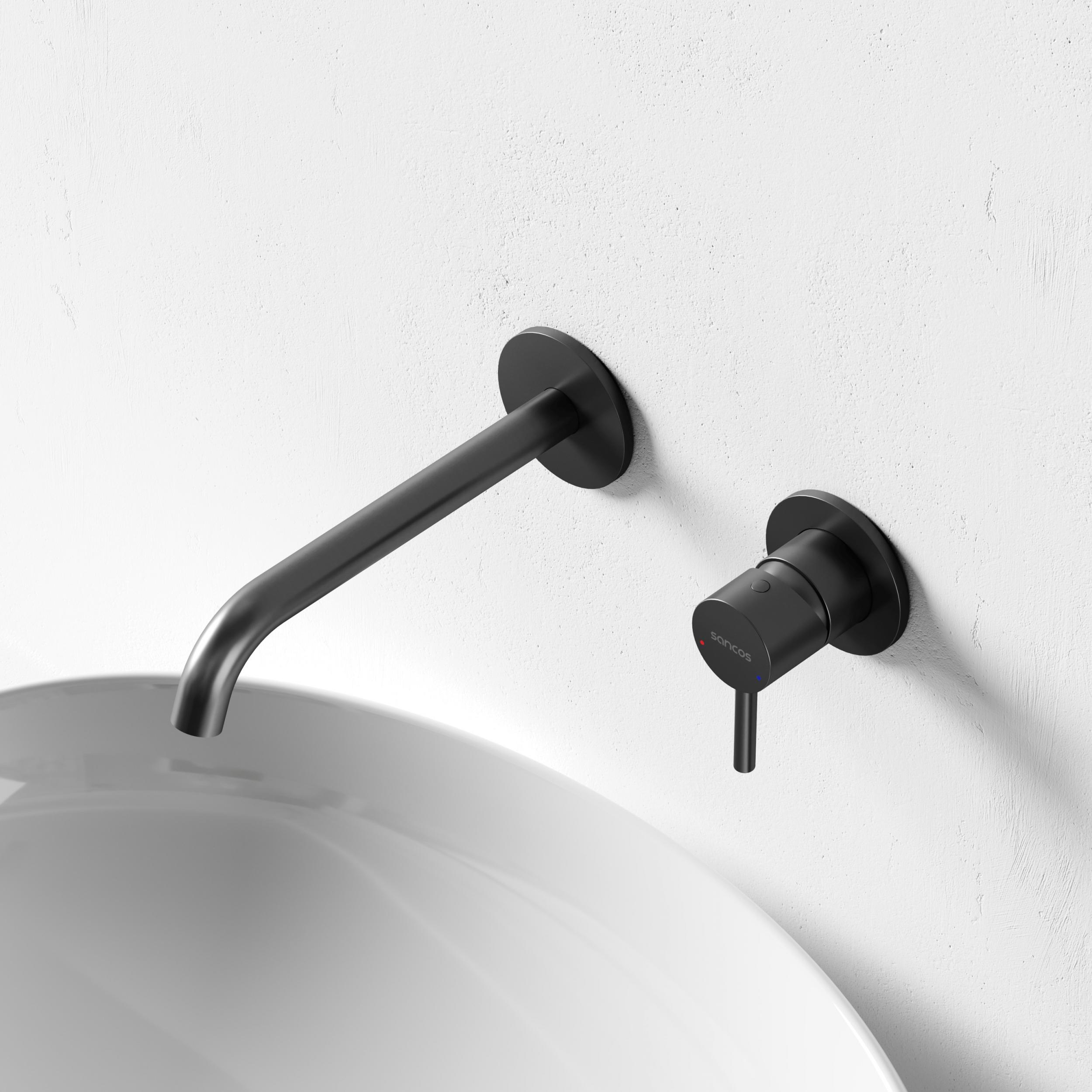 Смеситель для раковины настенный Sancos Etna SC9004MB с внутренней частью в комплекте, материал латунь, цвет чёрный матовый.