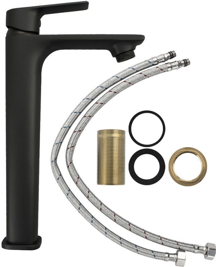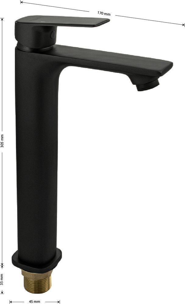 Смеситель для раковины, высокий литой корпус, цвет чёрный, с прямым плоским изливом, ручка литая, шаровый. Крепление резьба - гайка, картридж d = 35 мм. Аэратор для экономии воды. Такая модель может использоваться на домашней кухне, на даче, в медицинских учреждениях и общественных местах. Габаритные размеры: высота 305 мм, длина 170 мм, посадочное седло 45*45 мм, длина резьбы 35 мм, длина подводки 500 мм. Вес - 1,500 кг, объём - 0,00532 м3. В комплекте паспорт, корпус, подводка 1/2, крепеж, набор прокладок.