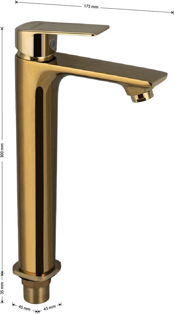Смеситель для раковины, высокий, литой корпус, цвет золото, с прямым плоским изливом, ручка литая, шаровый. Крепление резьба - гайка, картридж d = 35 мм. Аэратор для экономии воды. Такая модель может использоваться на домашней кухне, на даче, в медицинских учреждениях и общественных местах. Габаритные размеры: высота 300 мм, длина 175 мм, посадочное седло 45*45 мм, длина резьбы 35 мм, длина подводки 500 мм. Вес - 1,45 кг, объём - 0,00591 м3. В комплекте паспорт, корпус, подводка 1/2, крепеж, набор прокладок.