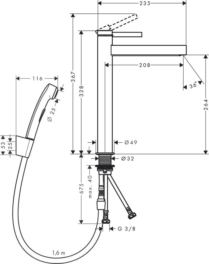 Характеристики смеситель для раковины высокий,смеситель для раковины с гигиеническим душем Hansgrohe (76220670)