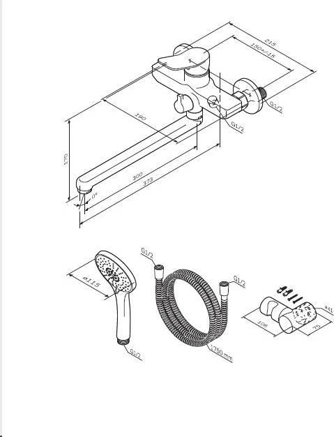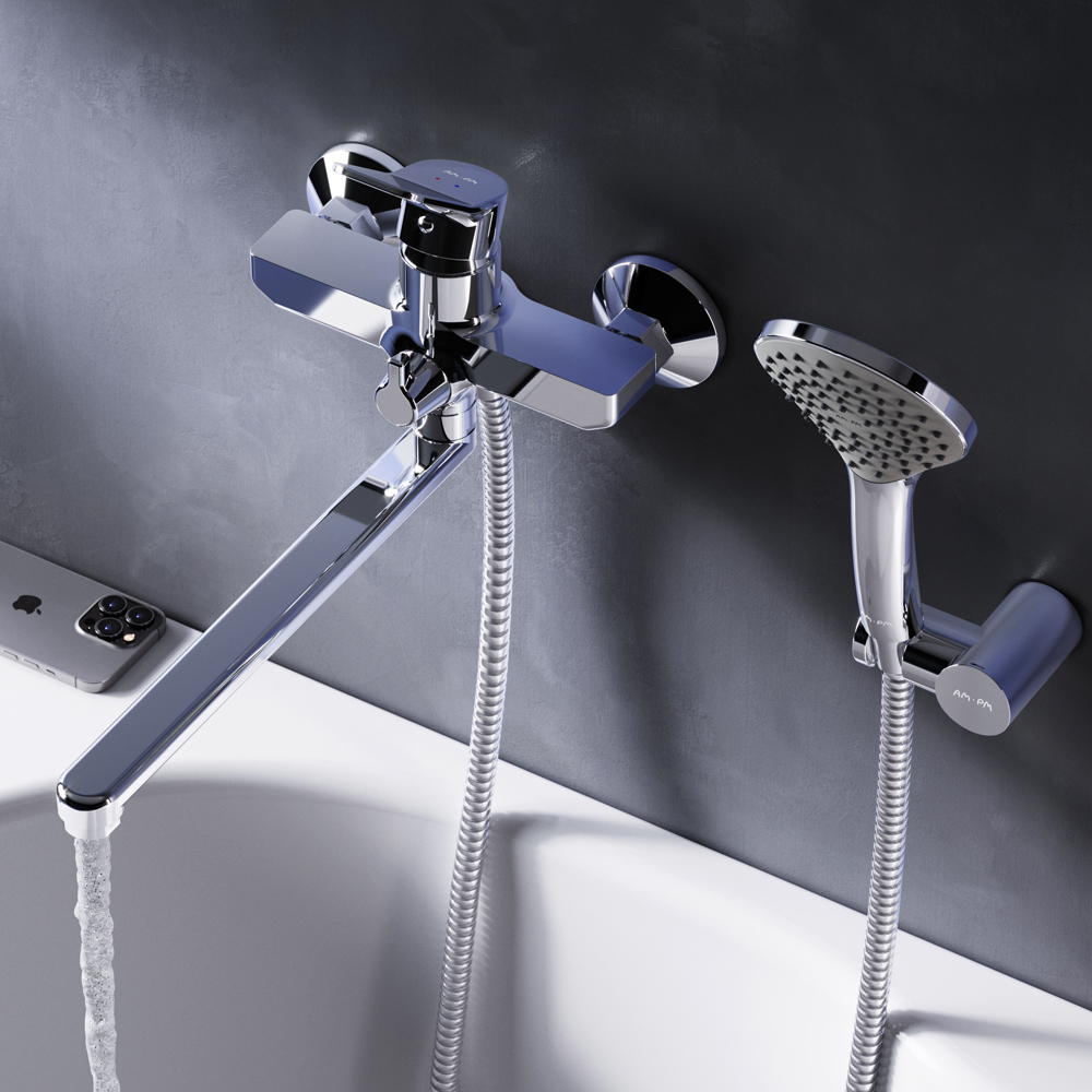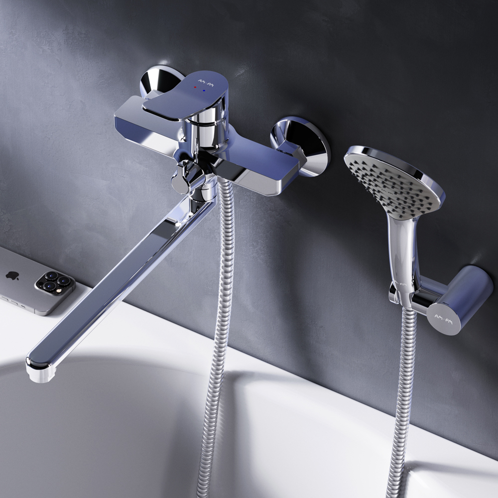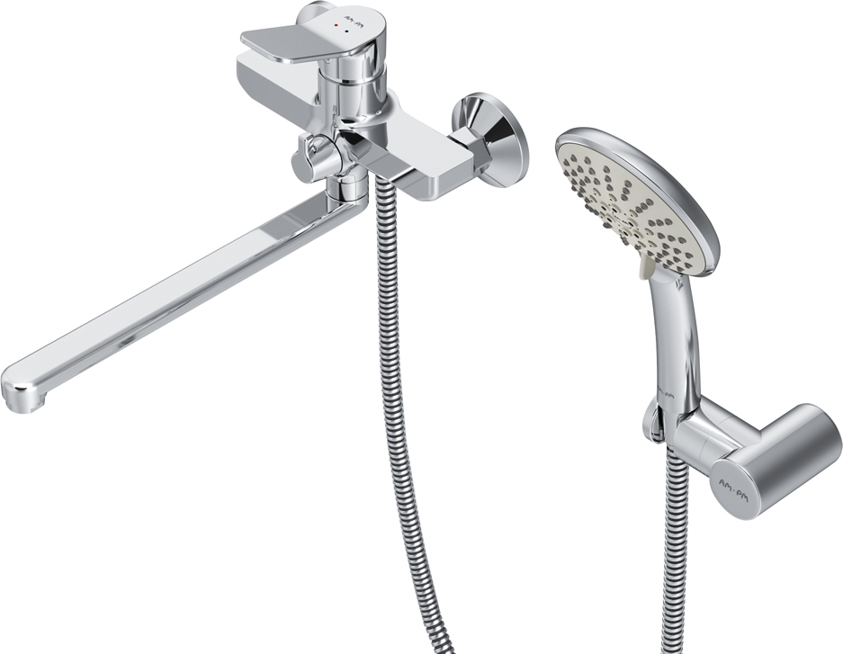 Смеситель для ванны AM.PM X-Joy F85A95000, с длинным изливом 300 мм и душевым гарнитуром, ручной душ с 5 режимами, шланг - 1750 мм, материал - латунь, цвет - хром.