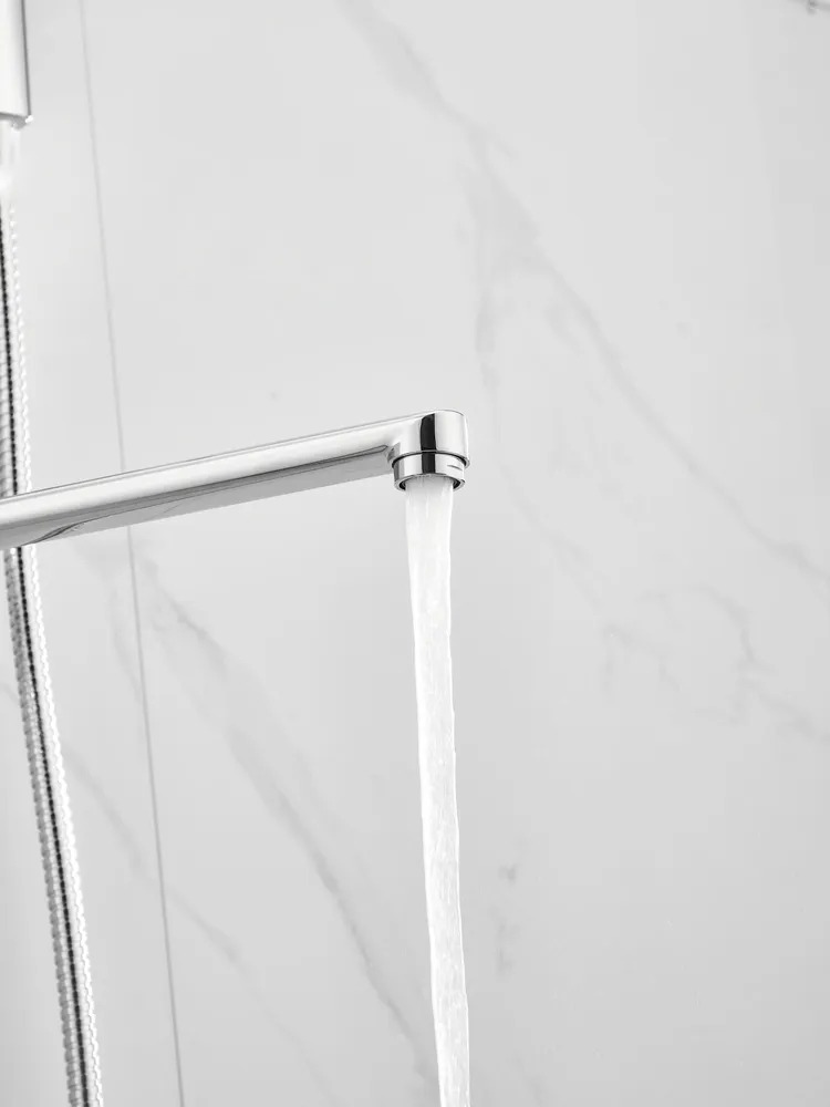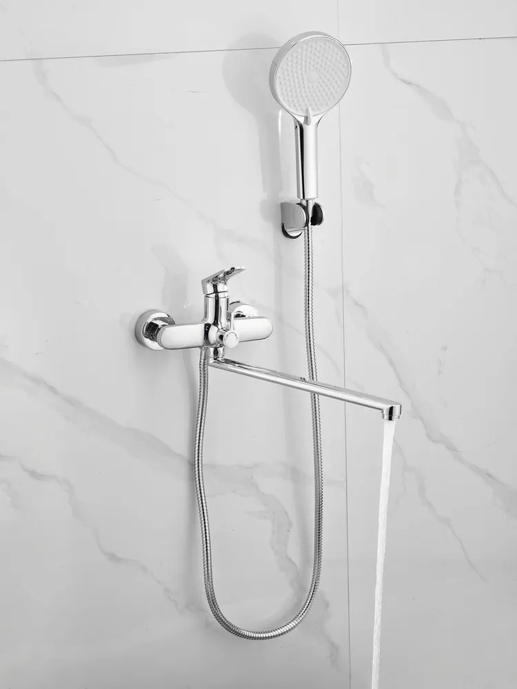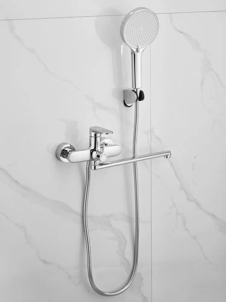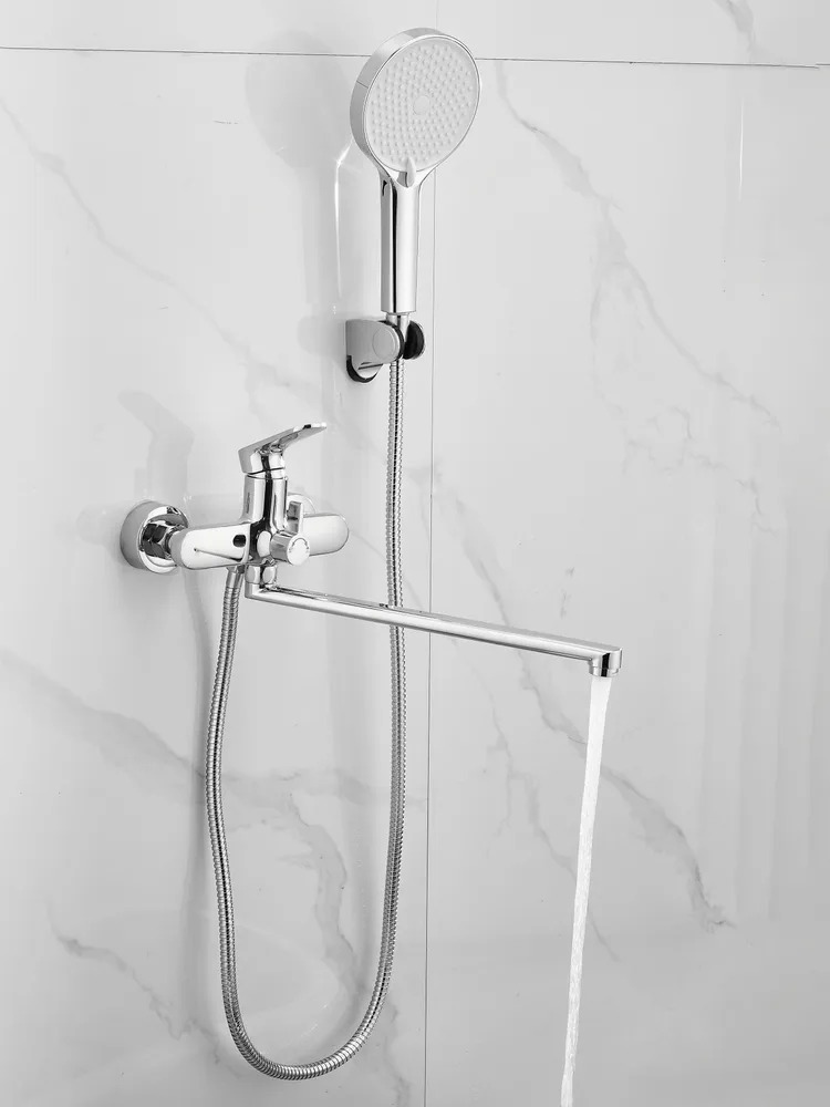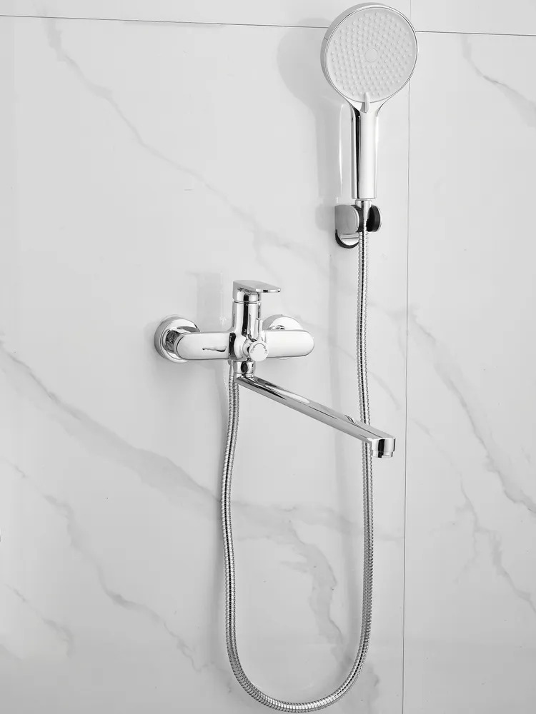 Смеситель для ванны Belz B22713 с длинным изливом и душевым гарнитуром, материал латунь, цвет хром.