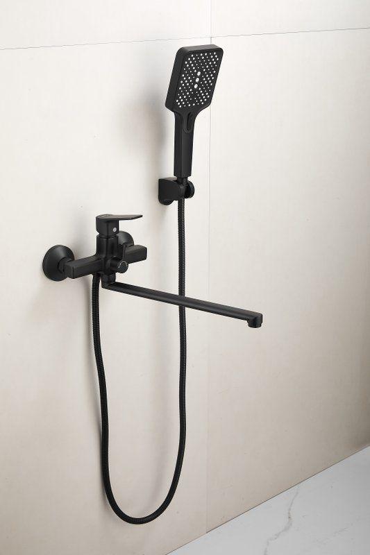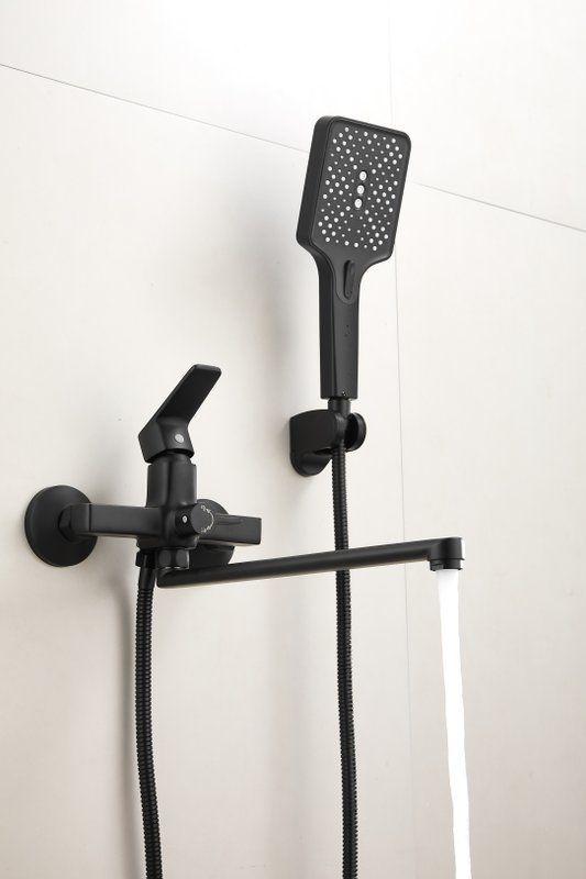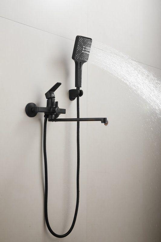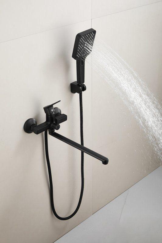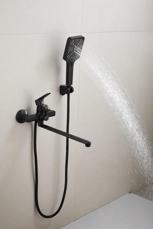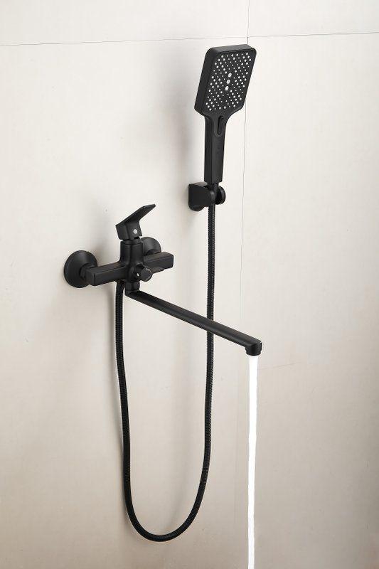 Смеситель для ванны Belz B22715-7 с длинным изливом и душевым гарнитуром, материал латунь, цвет чёрный матовый.